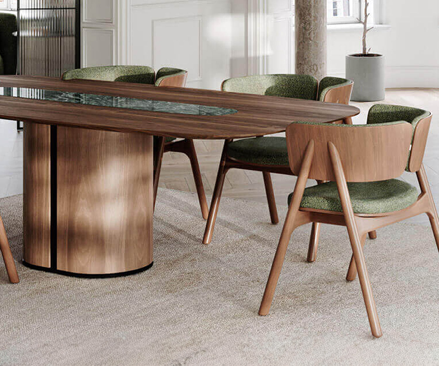 Der Tisch ist auch in der Kombination von Walnussfurnier und Keramik Grün verfügbar, wobei die Tischplatte das besondere Detail von Aosta Grün im Inneren aufweist – ein Highlight für Ihr Zuhause. Der Sockel ist hier ebenfalls in Walnussfarben erhältlich.