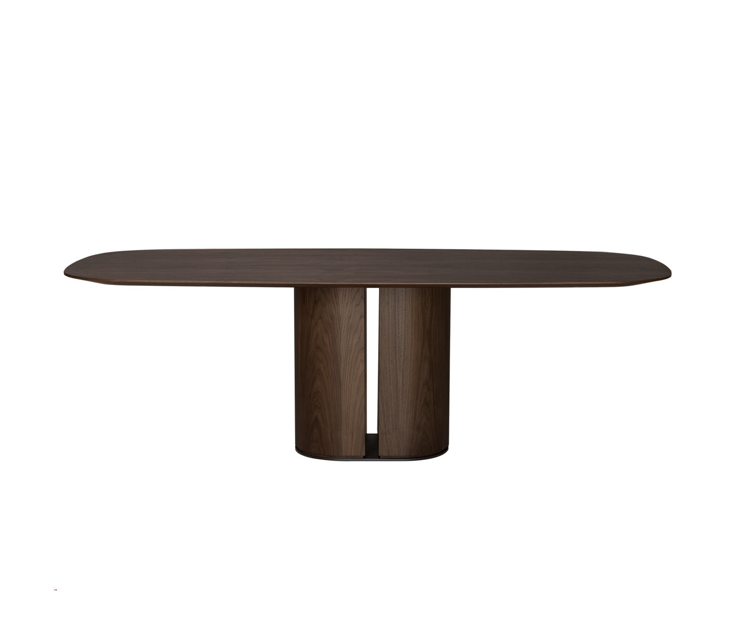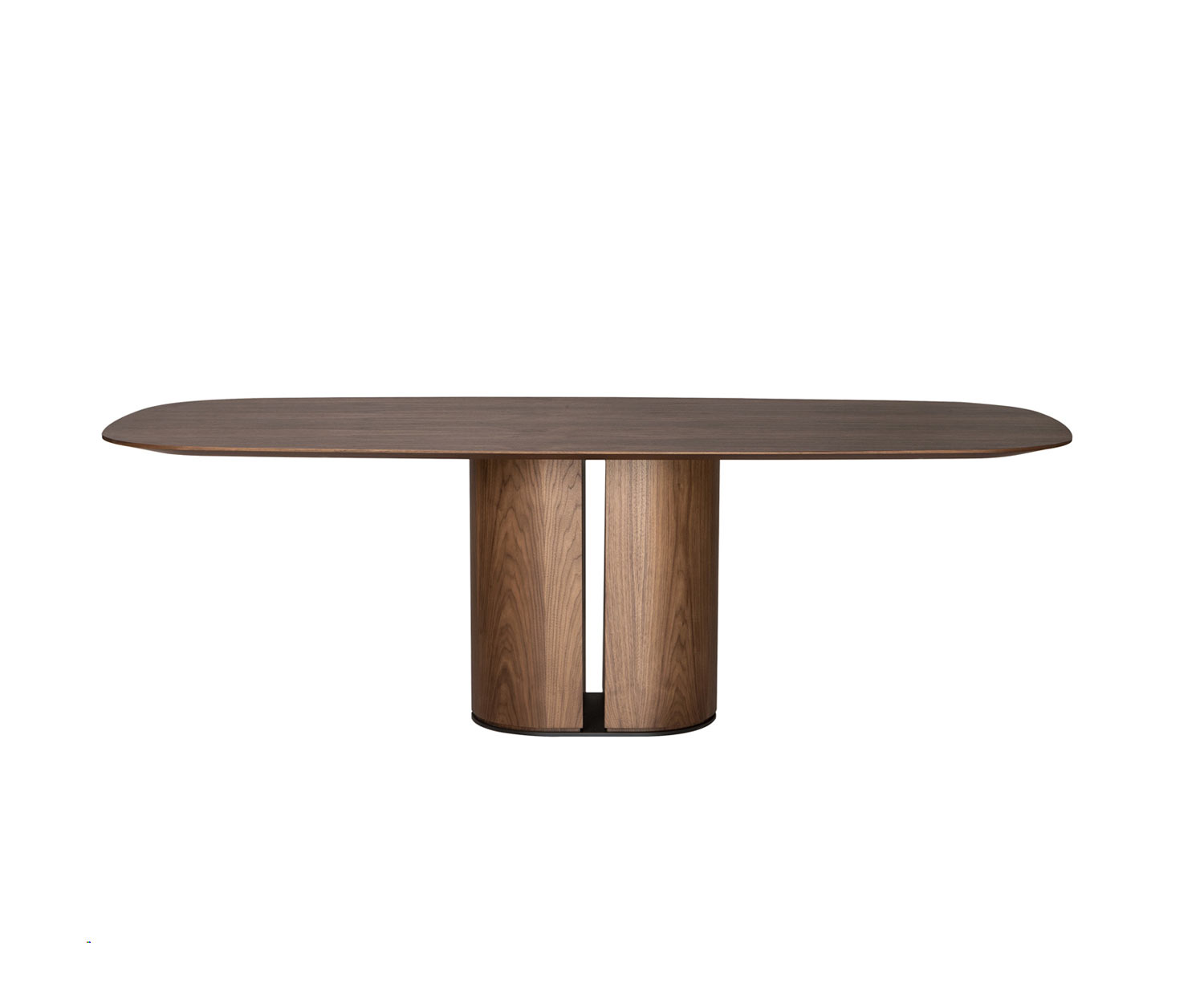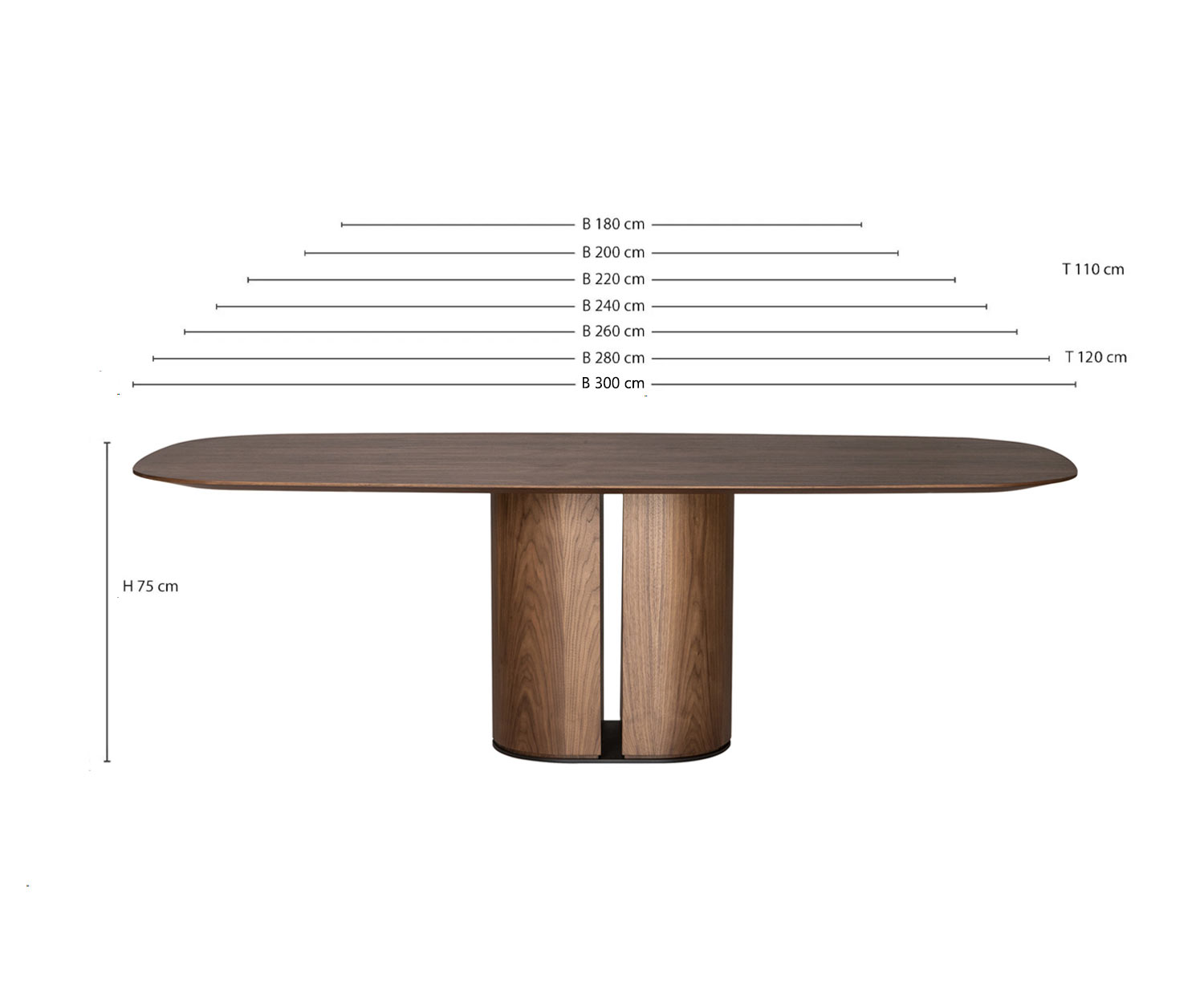 Die Holzfurnier-Ausführung des Tisches besteht aus einer robusten MDF-Platte, die mit edlem amerikanischen Walnussfurnier oder dunklem Smoked Eucalyptus veredelt ist. Das Tischbein ist passend im gleichen Furnier erhältlich, was dem Tisch eine harmonische, stilvolle Optik verleiht.