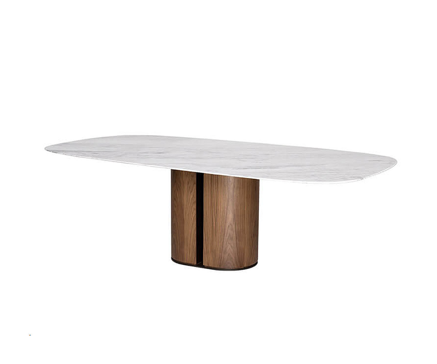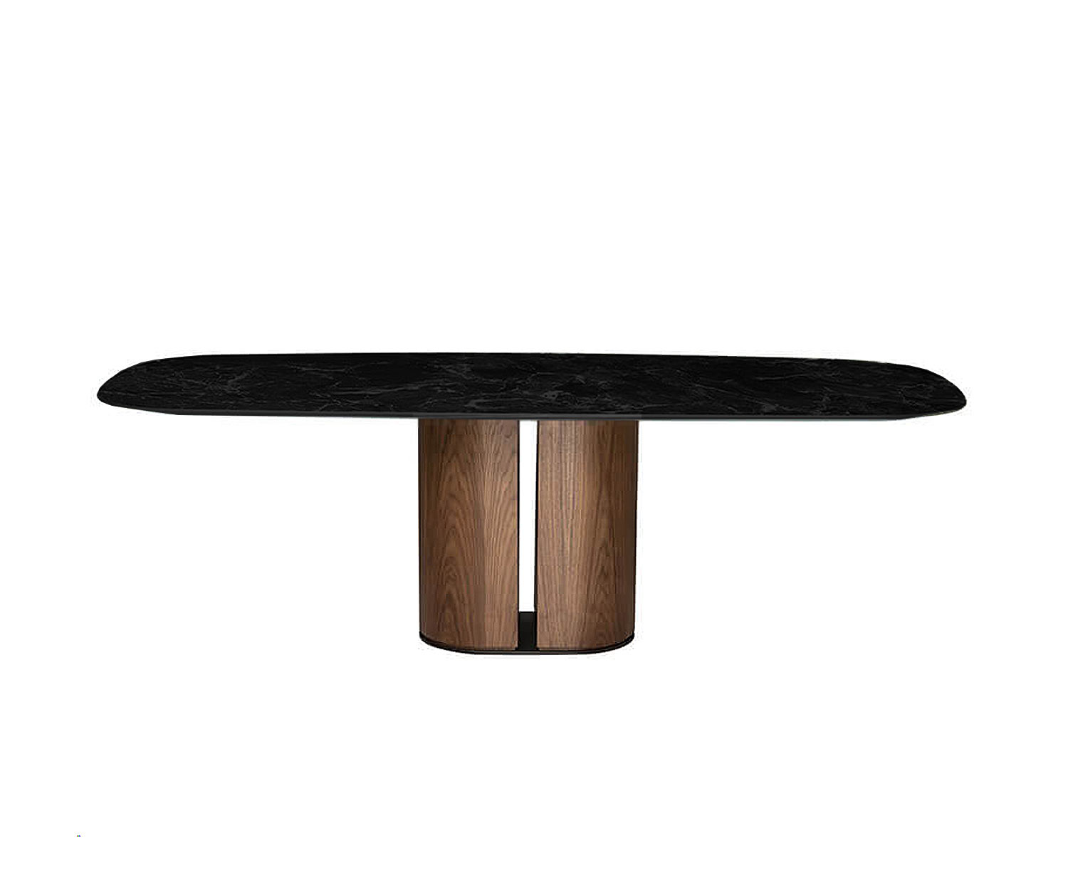 Für die Keramik-Tischplatte haben Sie die Wahl zwischen den edlen Varianten Marquina Schwarz und Carrara Weiß. In beiden Fällen ist der Sockel in Walnussfurnier gehalten, was die luxuriöse Ausstrahlung des Tisches noch unterstreicht.