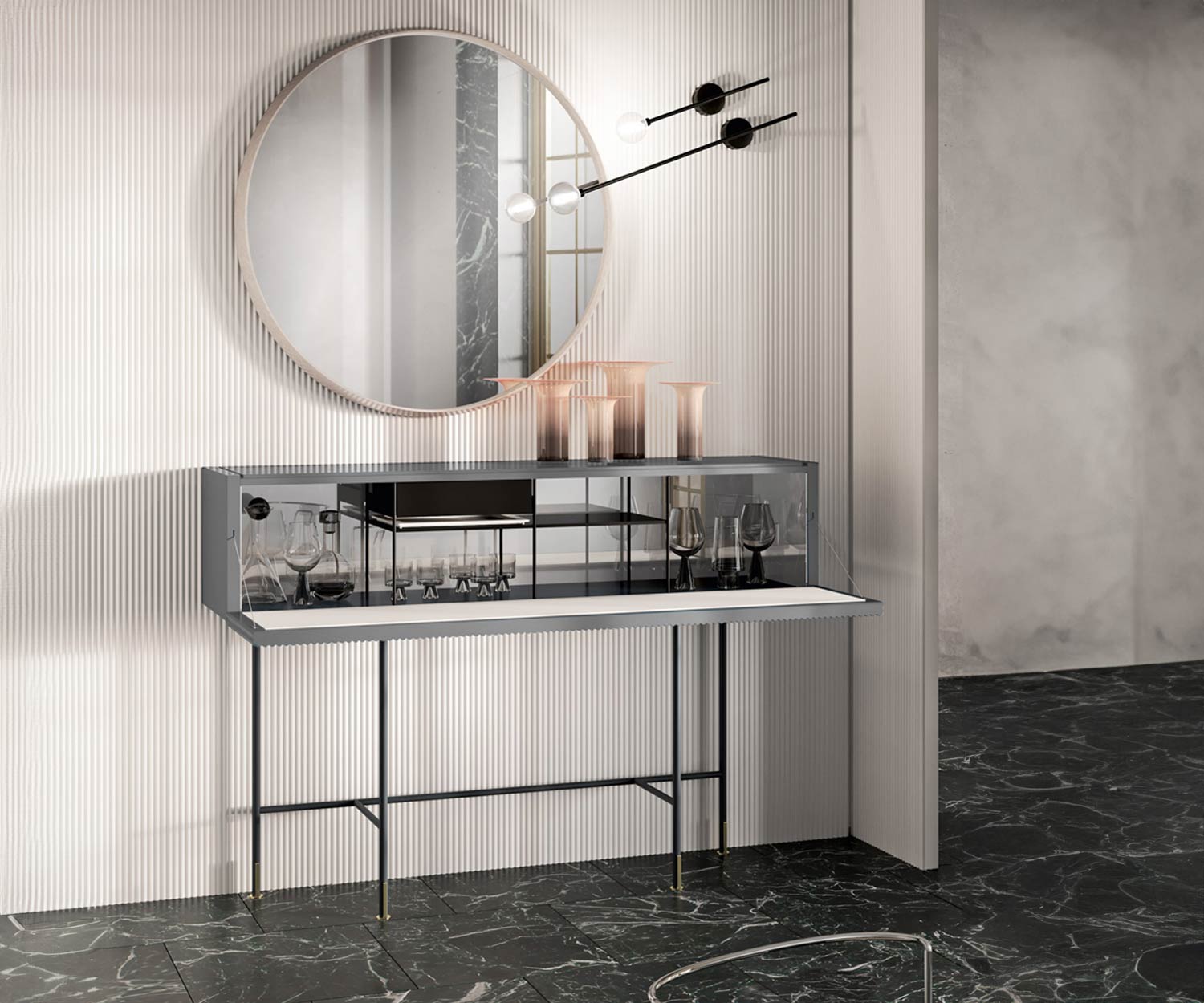 Das Aero Bar Sideboard öffnet sich durch 2 Drehtüren. Schlicht und geradlinig im Design verzichtet der Hersteller Capo d´Opera bei diesem hochwertigen Sideboard auf Griffe und schafft so eine sehr elegante Front. Der Innenkorpus des Bar Cabinets wird durch 4 fixe Tablare aus MDF aufgeteilt und beinhaltet ebenfalls eine Innenschublade. In dieser Version ist nur das obere Fach mit Spiegeln ausgestattet, die Rückwand in den unteren Fächern ist immer nach Wunschfarbe matt lackiert. Die Türen sind mit Haltern für Gläser ausgestattet.
