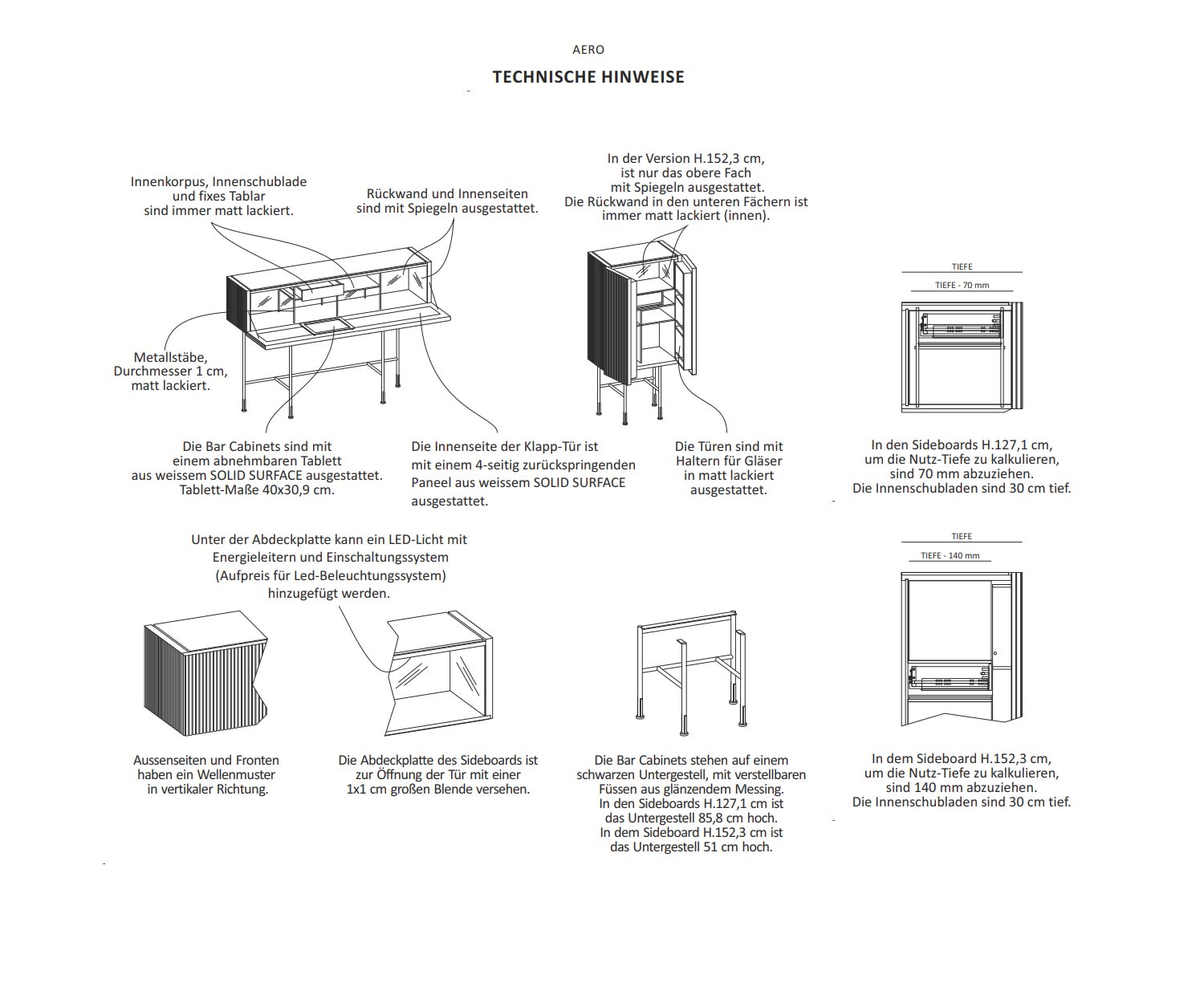 Die Tür des Capo d´Opera Aero Bar Sideboards bestehen aus einer nach unten geklappten Tür. Der Innenkorpus des Sideboards sowie das fixe Tablar und die Innenschublade sind passend zu den Fronten und Außenseiten matt lackiert. Die Metallstäbe, die die Innenschublade tragen haben einen Durchmesser von 1 cm. Die Rückwand und die Innenseiten sind mit Spiegeln ausgestattet. Die Innenwand der Klapptür ist mit einem 4-seitig zurückspringendem Paneel aus aus weißem Solid Surface ausgestattet.