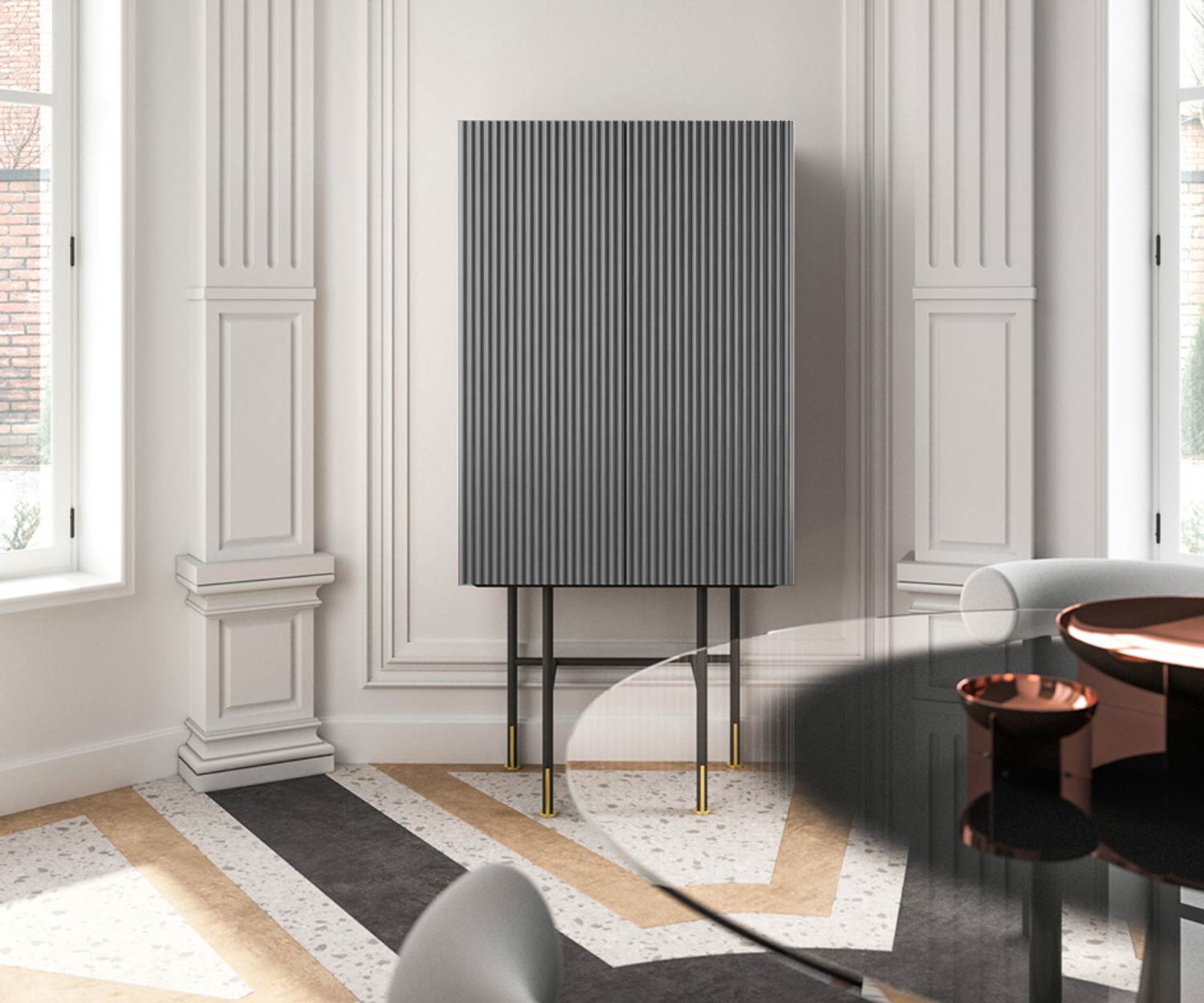 Der Korpus des Capo d´Opera Aero Bar Sideboards ist im Innenkorpus passend zu den Fronten und Außenseiten farbig matt lackiert. Die Klapptüren des Sideboards bestehen aus einer hochwertigen MDF Platte. Die Fronten und Außenseiten sind im senkrecht geriffeltem Wellenmuster verkleidet.
