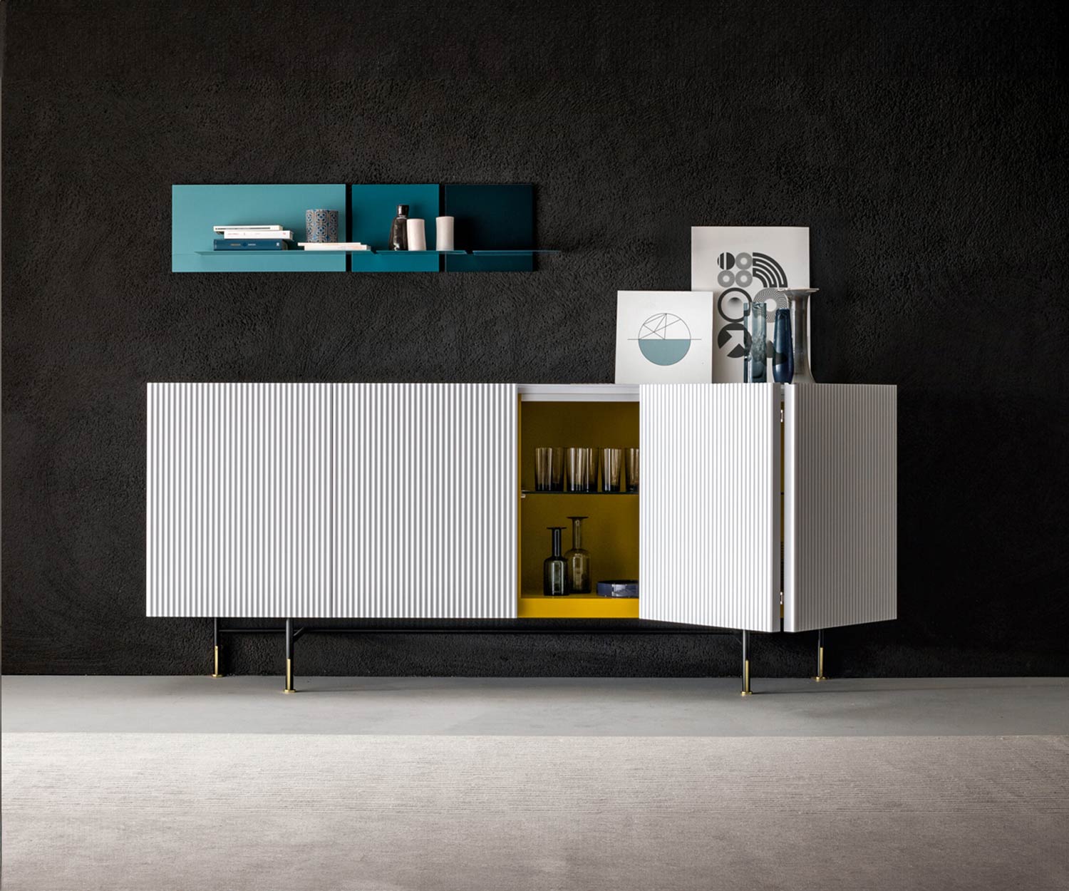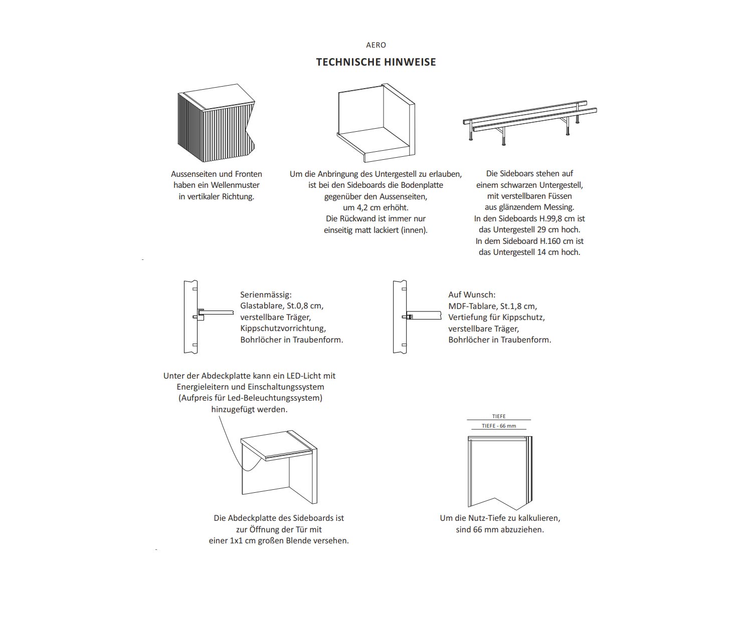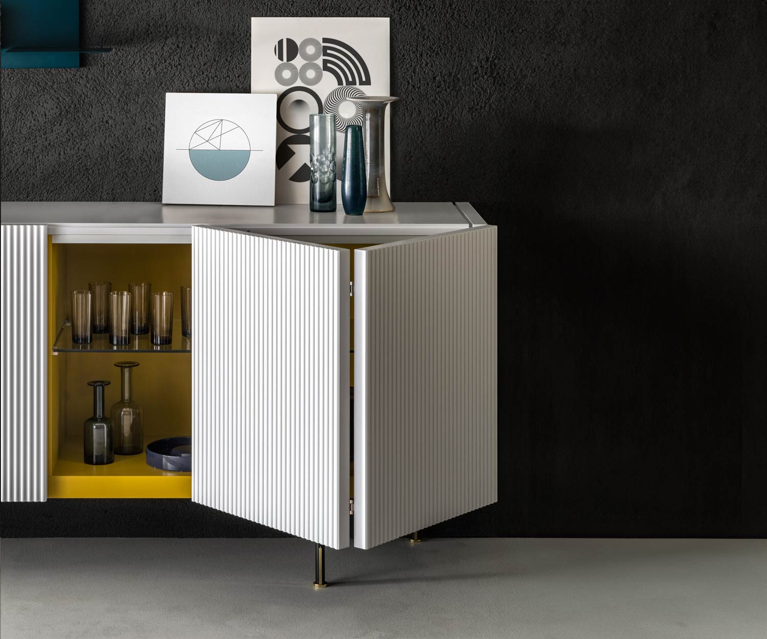 Der Korpus des Capo d´Opera Aero Sideboards ist im Innenkorpus passend zu den Fronten und Außenseiten farbig matt lackiert. Die Türen des Sideboards bestehen aus einer hochwertigen MDF Platte, mit Fronten und Außenseiten im senkrecht geriffeltem Wellenmuster.