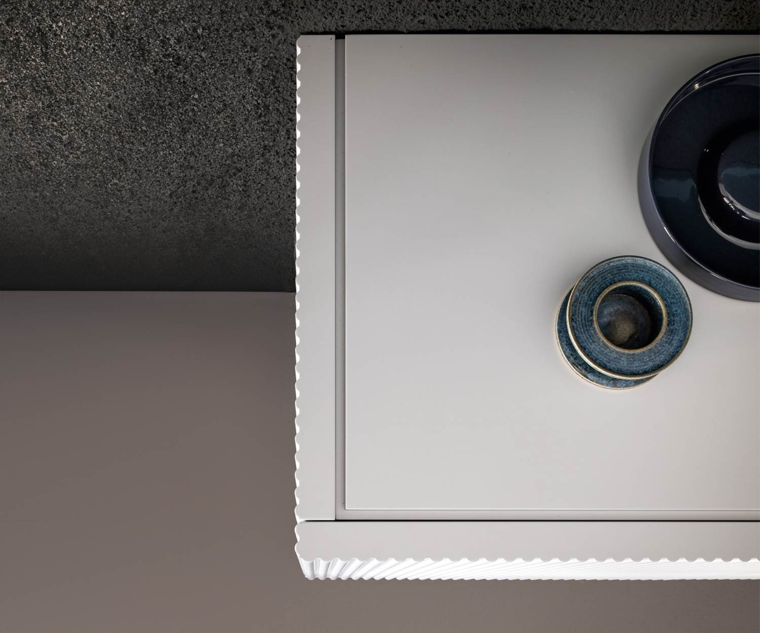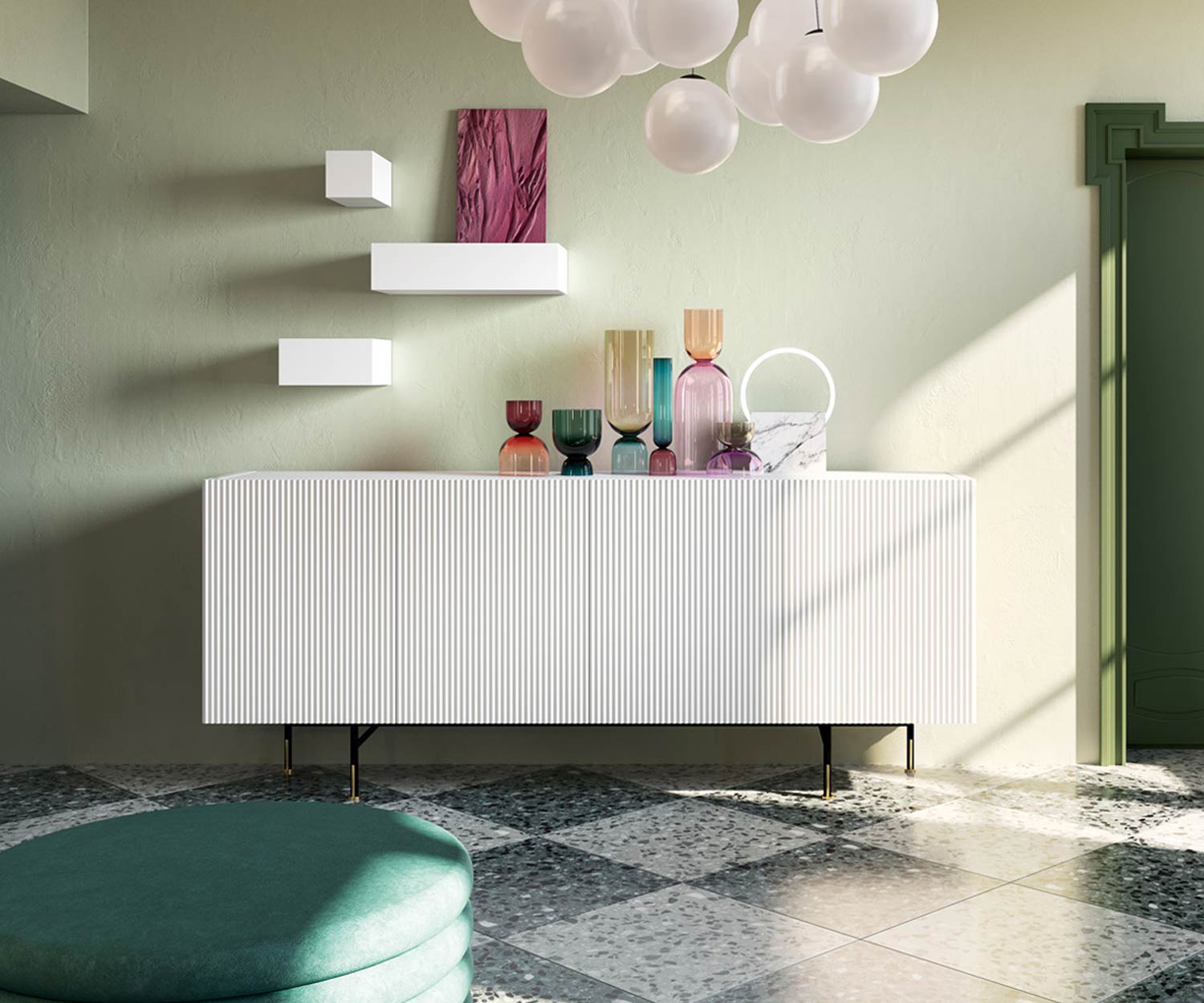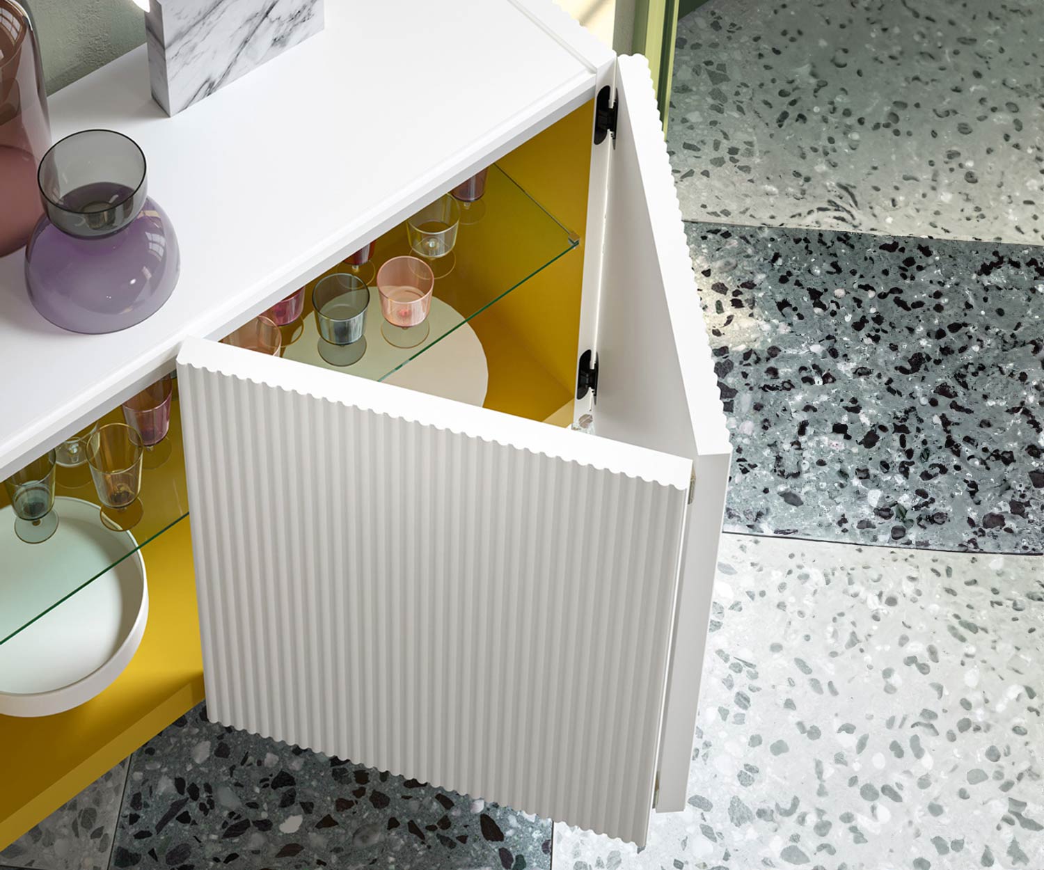 Der Korpus des Capo d´Opera Aero Sideboards ist im Innenkorpus passend zu den Fronten und Außenseiten farbig matt lackiert. Die Türen des Sideboards bestehen aus einer hochwertigen MDF Platte, mit Fronten und Außenseiten im senkrecht geriffeltem Wellenmuster.