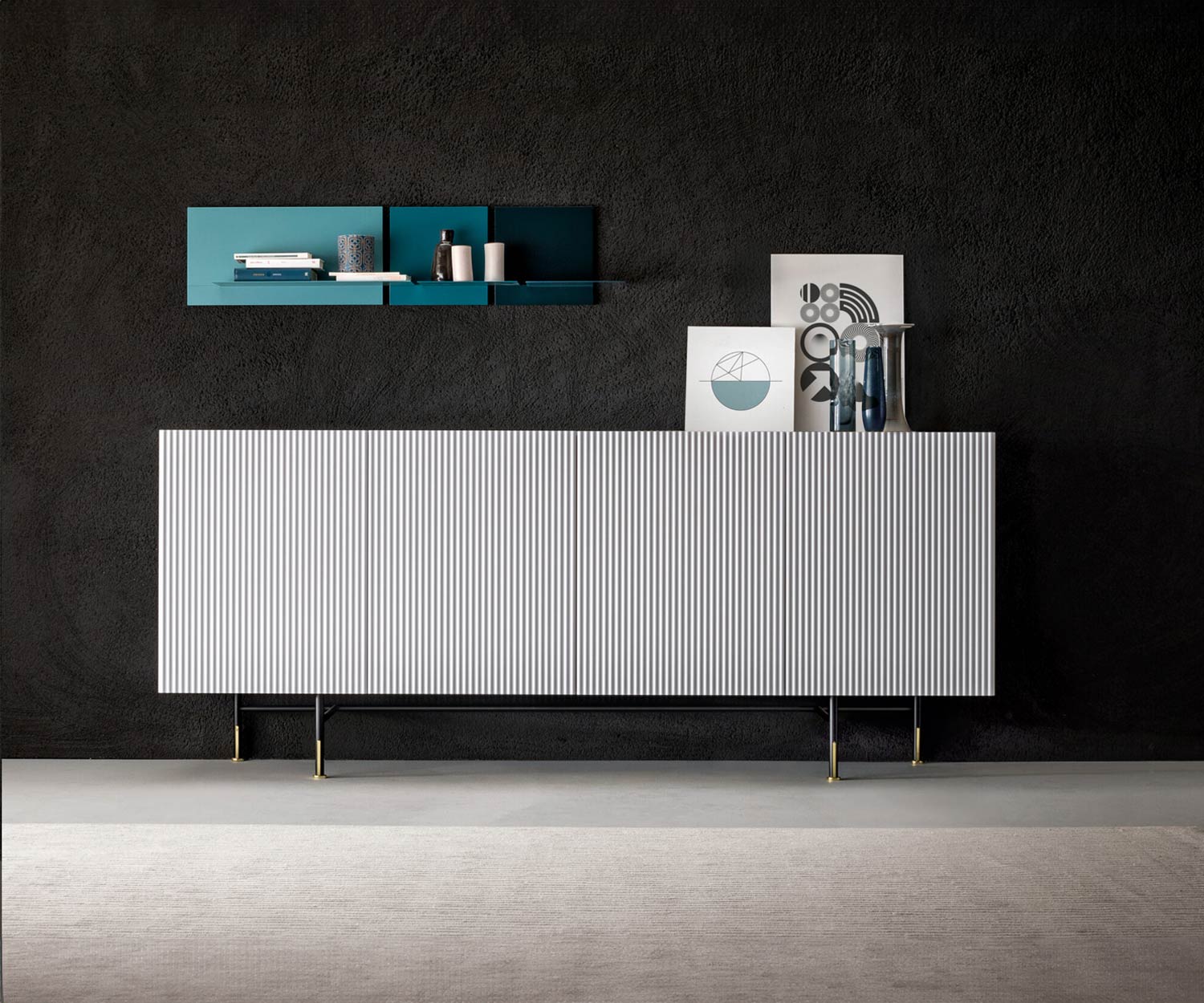Der Korpus des Capo d´Opera Aero Sideboards ist im Innenkorpus passend zu den Fronten und Außenseiten farbig matt lackiert. Die Türen des Sideboards bestehen aus einer hochwertigen MDF Platte, mit Fronten und Außenseiten im senkrecht geriffeltem Wellenmuster.
