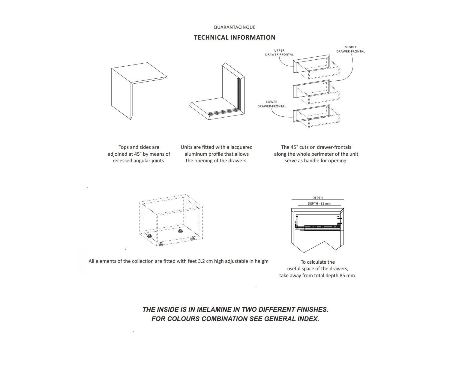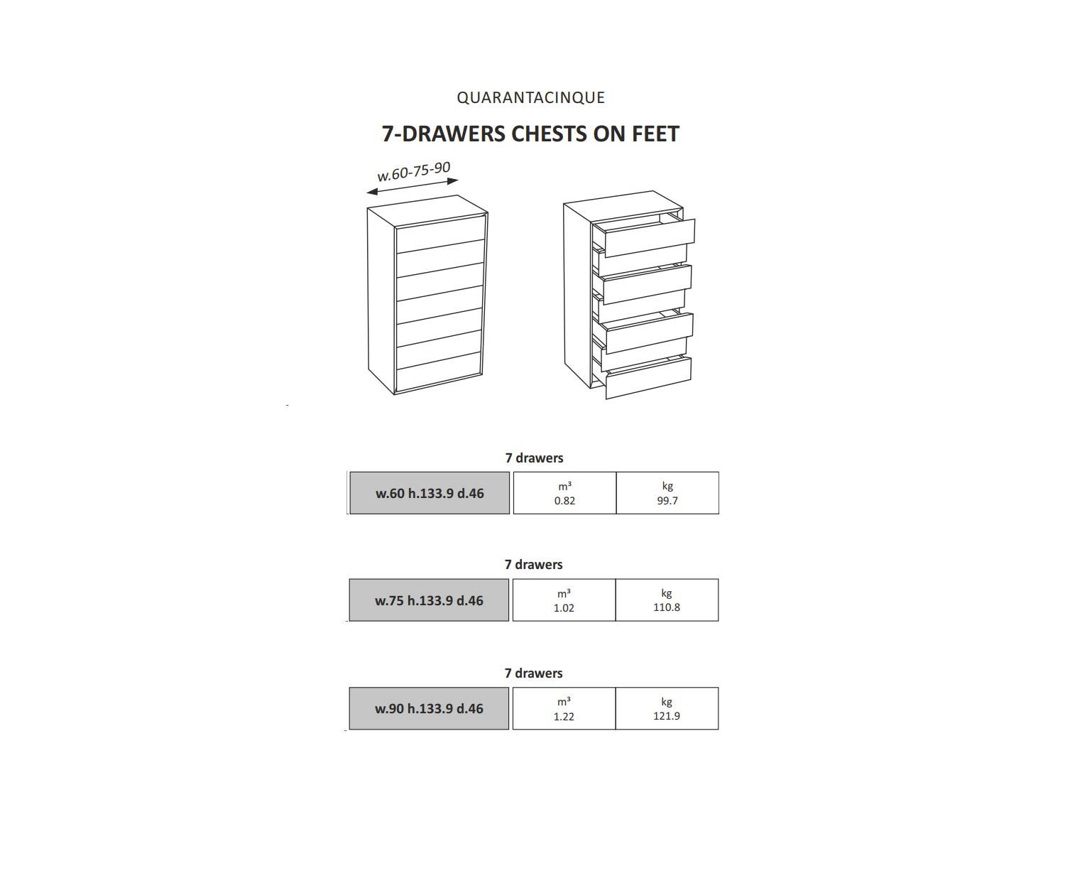 Erhältlich in verschiedenen Größen, passt sich die Quarantacinque Kollektion flexibel an Ihre Bedürfnisse an – sei es als Kommode, Nachttisch oder Hochkommode.