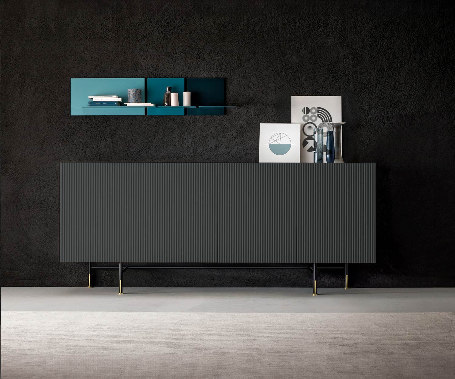 Le corps du sideboard Capo d'Opera Aero est laqué en couleur mate dans le corps intérieur, assorti aux façades et aux côtés extérieurs. Les portes du sideboard sont composées d'un panneau MDF de haute qualité, avec des façades et des côtés extérieurs à motif ondulé vertical.