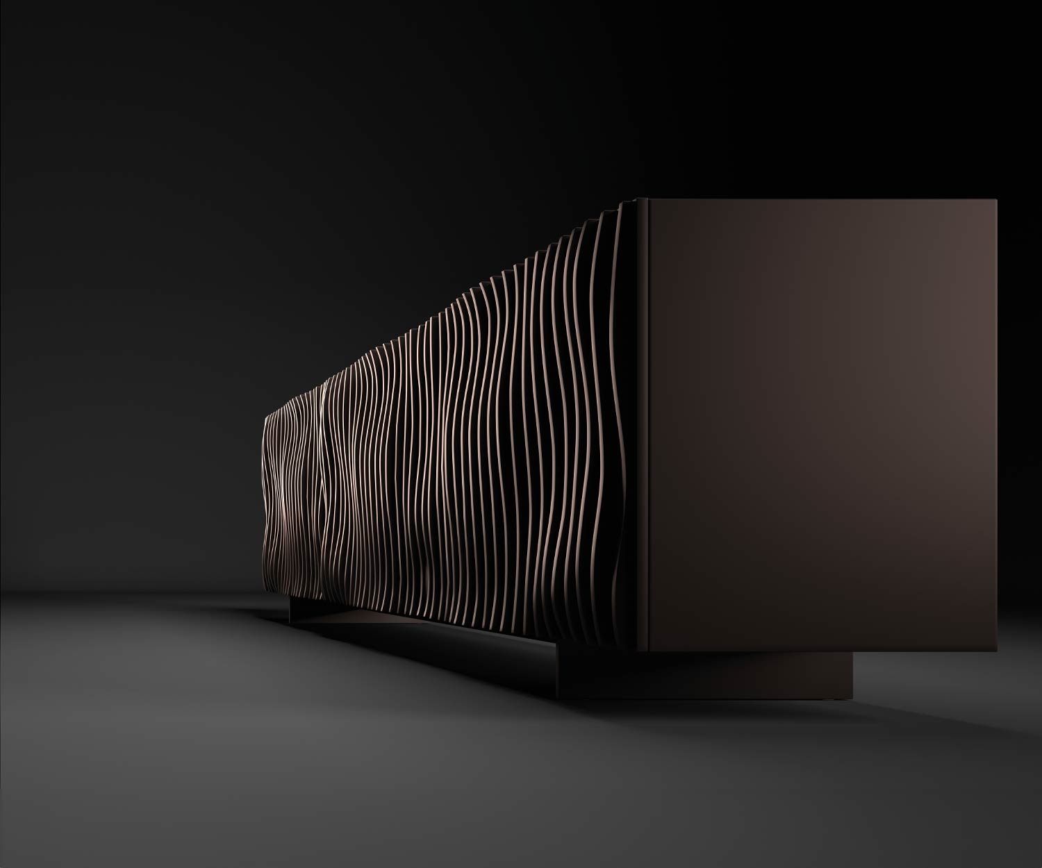 Les portes et le corps sont en bois laqué noble, parfaitement assortis. Les façades de différentes épaisseurs au design ondulé créent un jeu d'ombre et de lumière fascinant - subtil mais efficace. La finition précise souligne l'impression de qualité de ce meuble.