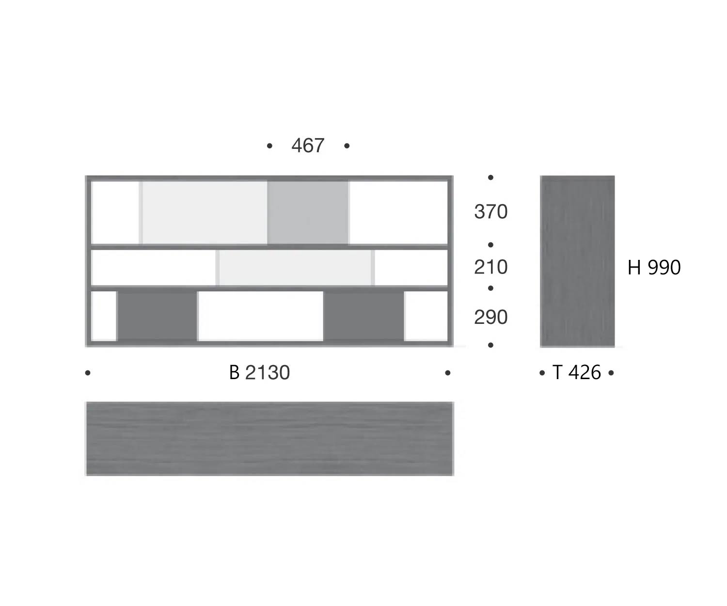 Les dimensions extérieures de l'étagère sont : L 213 cm / H 99,5 cm / P 42,6 cm.