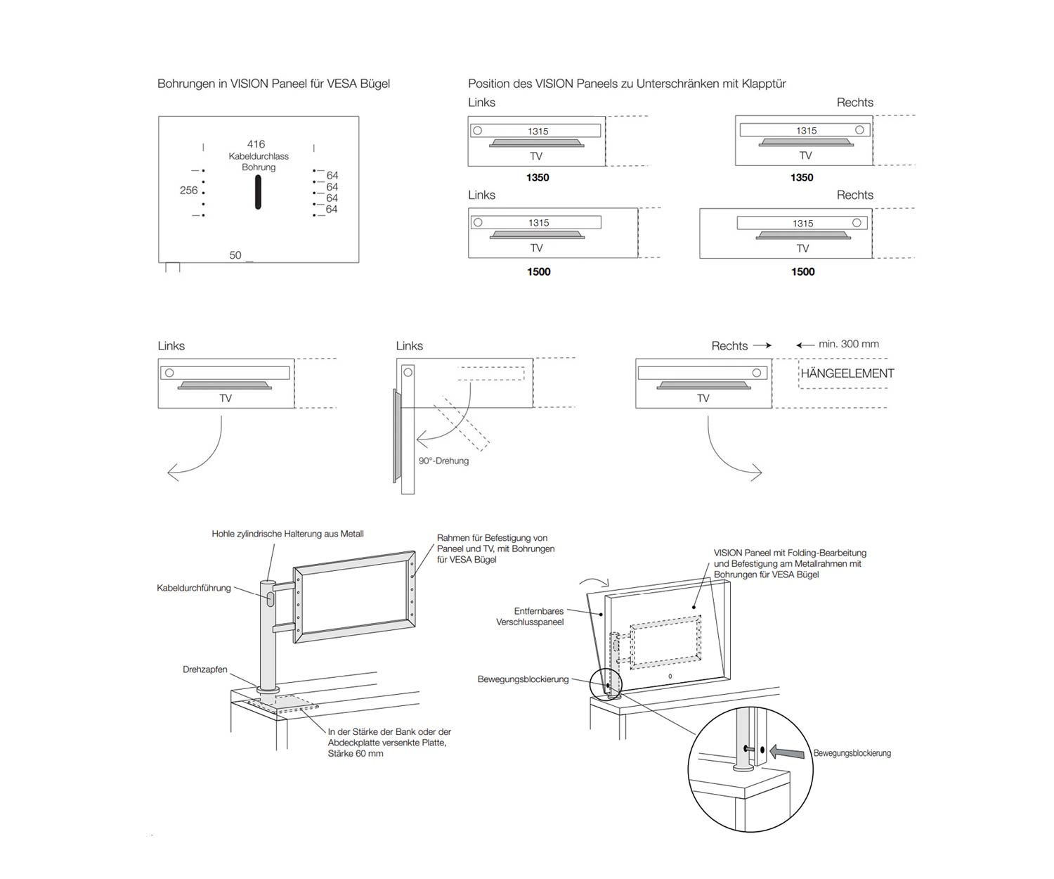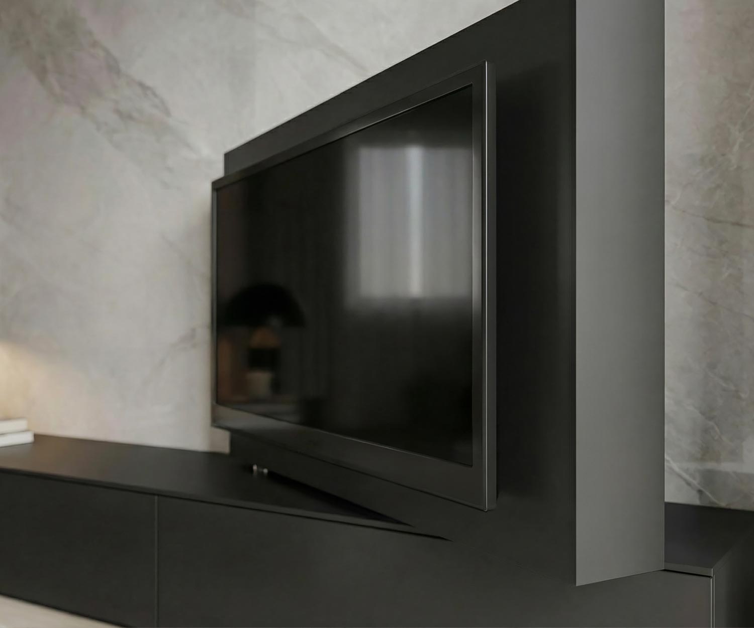 Le panneau TV peut être ouvert à l'arrière afin d'y faire passer tous les câbles et d'y visser la télévision. Le support TV pour le montage de la télévision sur le panneau n'est pas compris dans la livraison et doit être commandé séparément en fonction du modèle de télévision. Nous recommandons le support TV HAMA ULTRASLM, qui convient très bien à de nombreux modèles de téléviseurs.