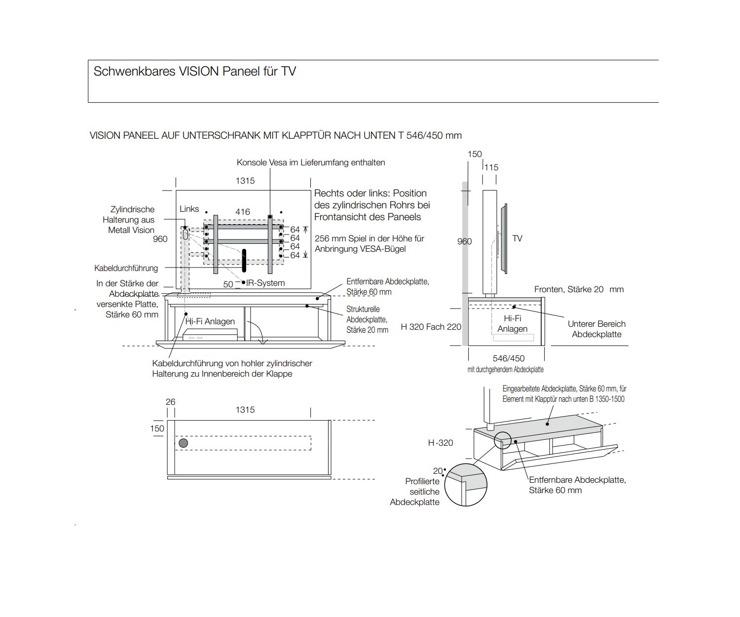 Une pression sur la façade permet d'ouvrir la porte abattante. À l'intérieur, on trouve une cloison ainsi qu'un tube qui relie les câbles des appareils à l'intérieur du lowboard au téléviseur. Le panneau TV peut être incliné jusqu'à 90°. Le panneau TV Vision pivotant a une largeur de 115 cm et peut être équipé d'un téléviseur de 50 pouces maximum. Il est possible d'accrocher un support de son choix sur le panneau. À l'intérieur du panneau TV se trouve un support en acier en forme de drapeau qui assure la stabilité nécessaire.
