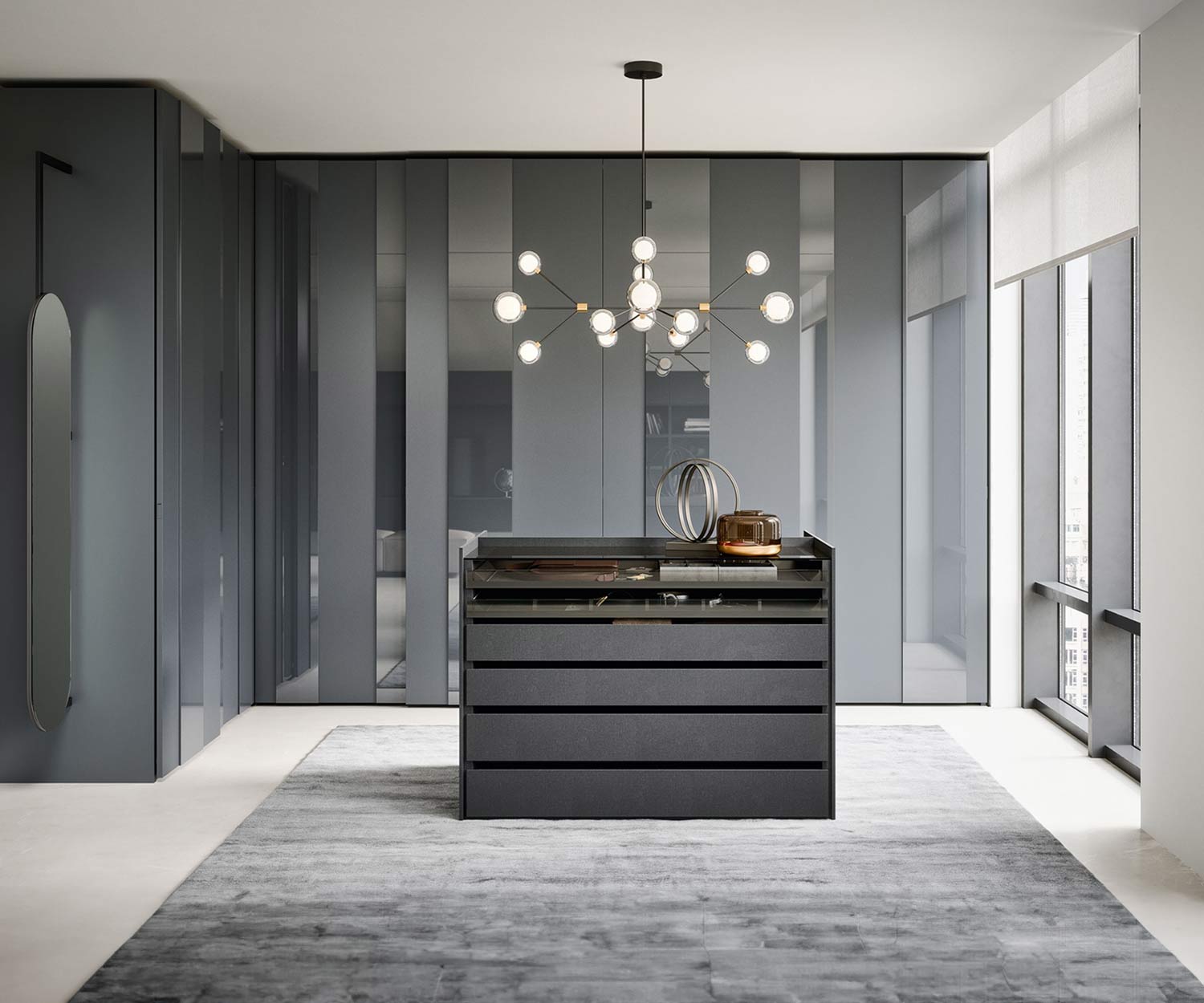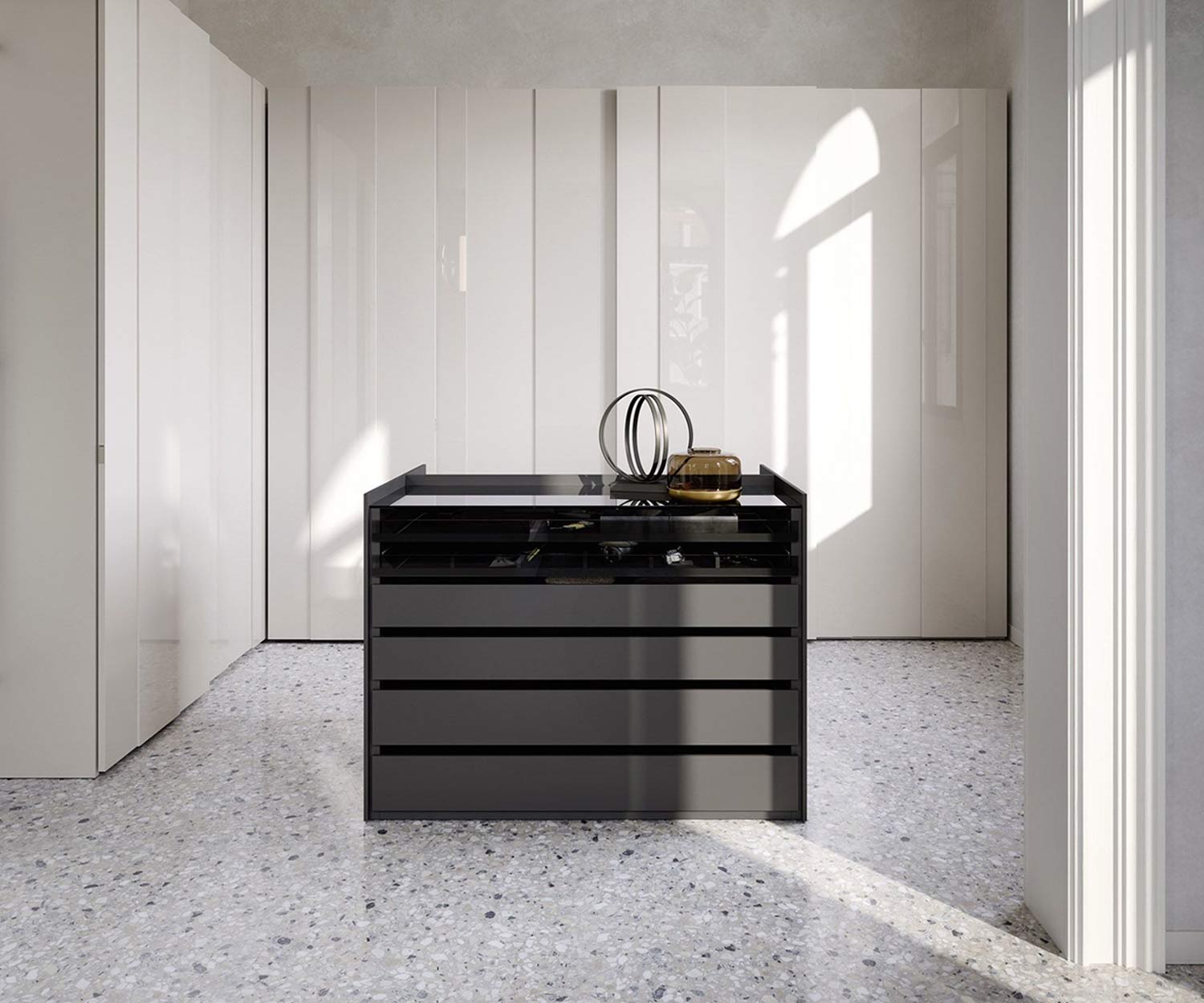L'îlot central Aristotele est un élément de rangement réversible qui s'intègre parfaitement au centre de la pièce d'un dressing. Il allie design esthétique et fonctionnalité pratique et offre, grâce à son agencement intérieur bien pensé, beaucoup de place pour les accessoires, les bijoux, les cravates, les ceintures et autres vêtements.