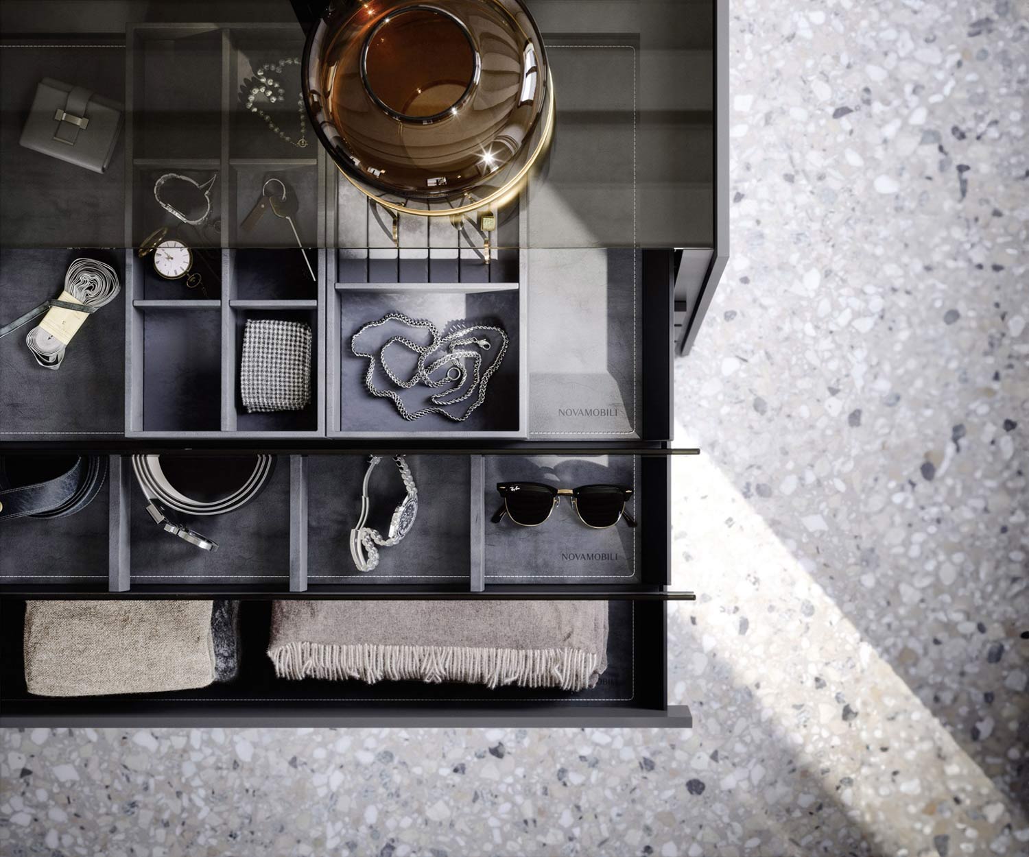 L'îlot de penderie Aristotele est livré sans les bacs de rangement intérieurs (comme on peut le voir sur les photos). Les accessoires sont disponibles en option sur demande. Veuillez vous adresser à notre service clientèle pour obtenir une offre.