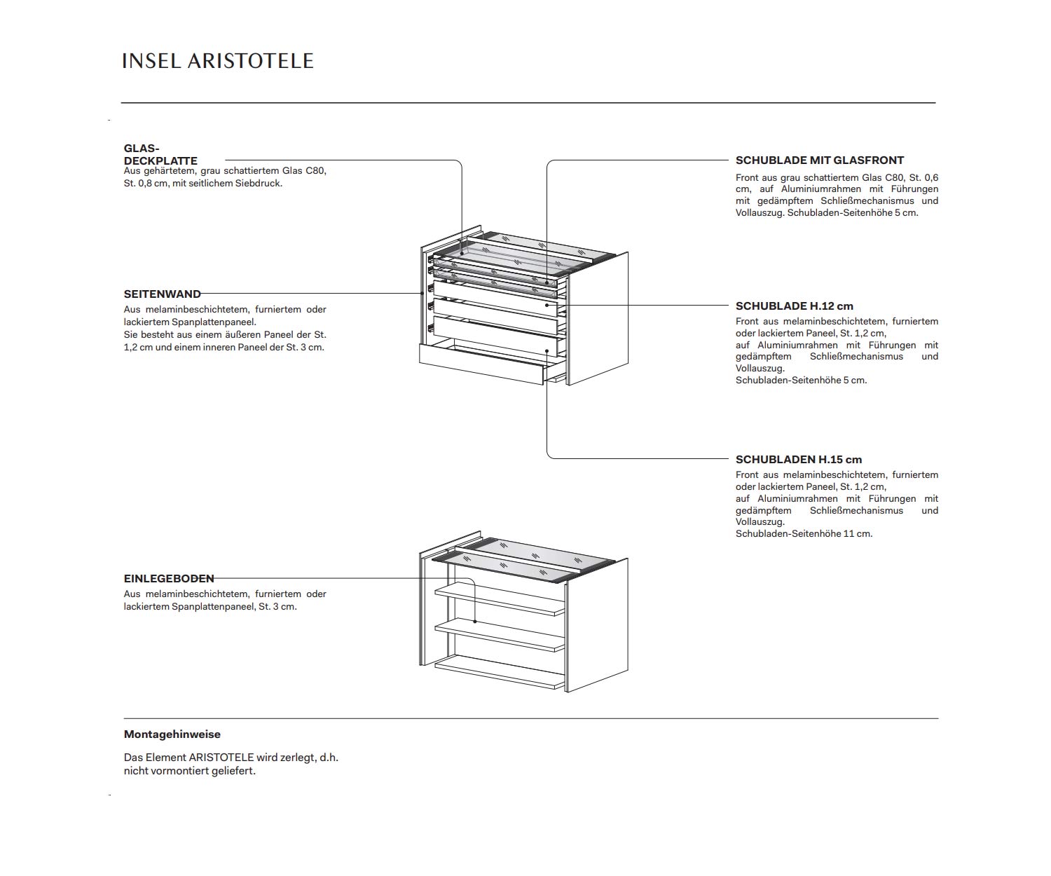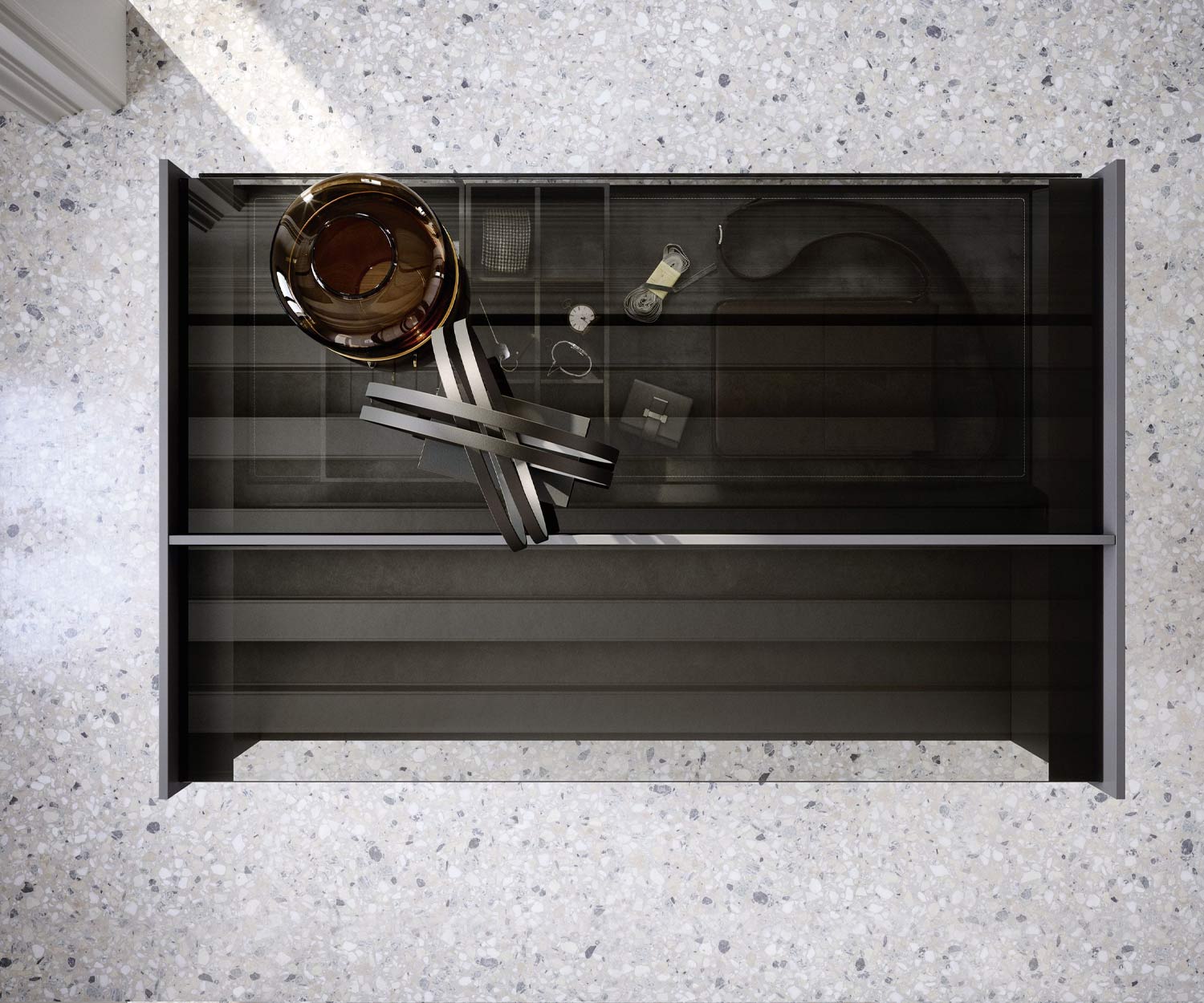 Les 2 étagères supérieures avec façade en verre disposent d'une façade en verre C80 gris ombré d'une épaisseur de 0,6 cm, encadrée par un cadre en aluminium. Les tiroirs sont équipés d'un mécanisme de fermeture amorti et d'une extension totale. La hauteur latérale de ces tiroirs est de 5 cm.