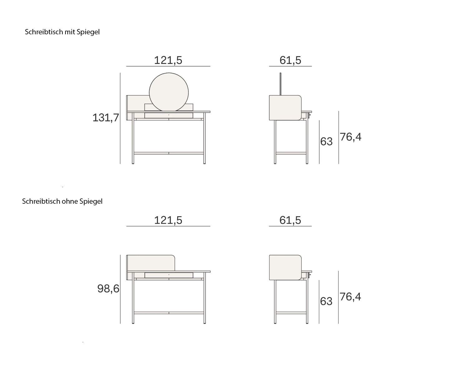 Le secrétaire Ninfea dispose d'un tiroir sous le plateau de table. Pour la version avec miroir de courtoisie, des boîtes de rangement supplémentaires sont disponibles derrière le miroir.