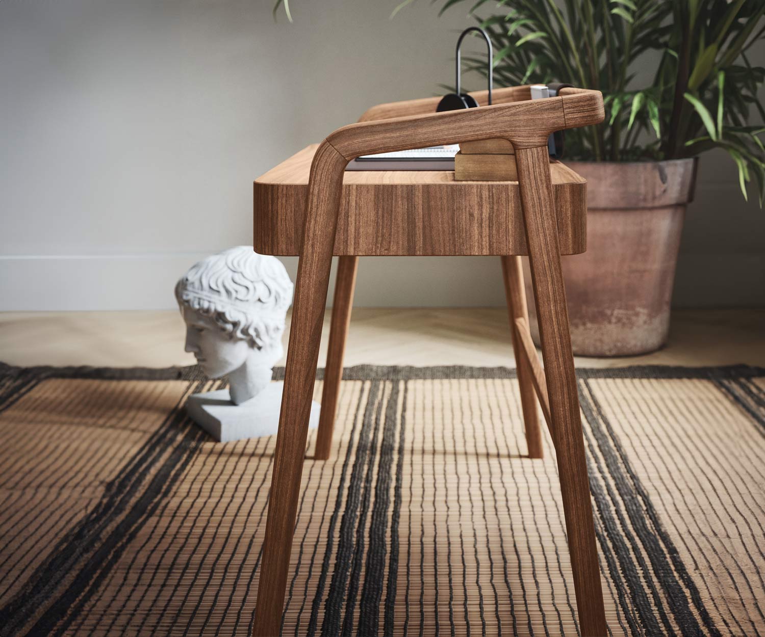 Magnifique bureau design en noyer de Novamobili. Le bureau Knot est fabriqué pour vous en Italie, uniquement sur commande. Le design nordique léger se distingue par une structure en bois déformée et rectiligne.