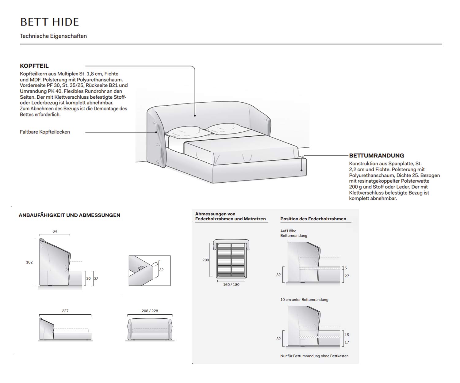 La tête de lit du lit Hide Novamobili est en multiplex (cinq couches de placage collées entre elles), en épicéa ainsi qu'en MDF et contient un rembourrage en mousse de polyuréthane. Le tour de lit contient également un rembourrage en mousse de polyuréthane ainsi qu'une construction en panneaux de particules et en épicéa.