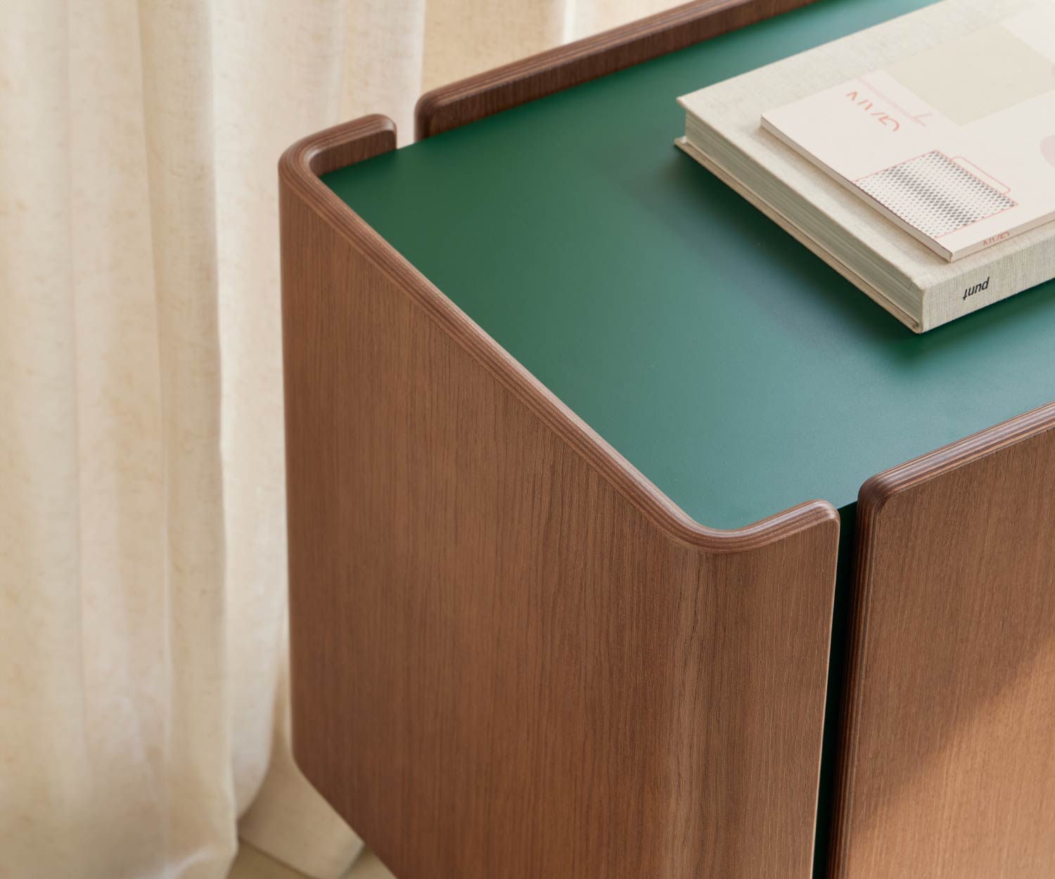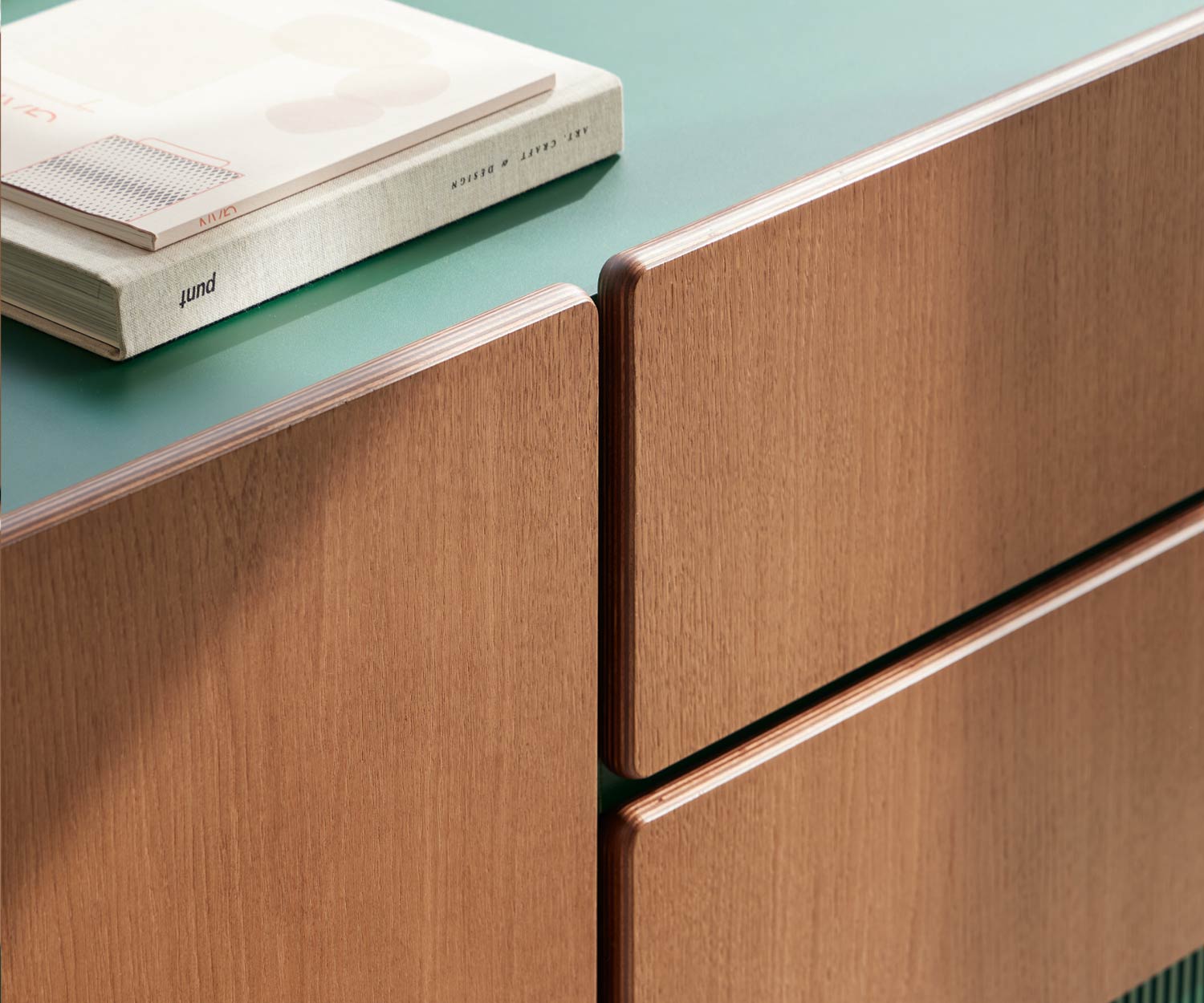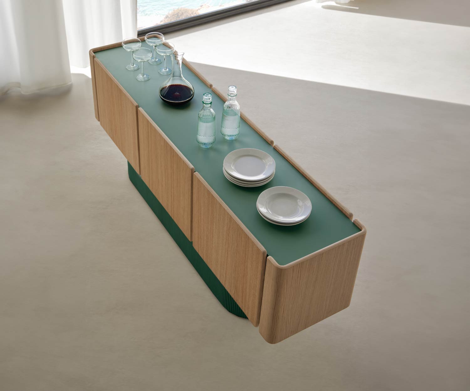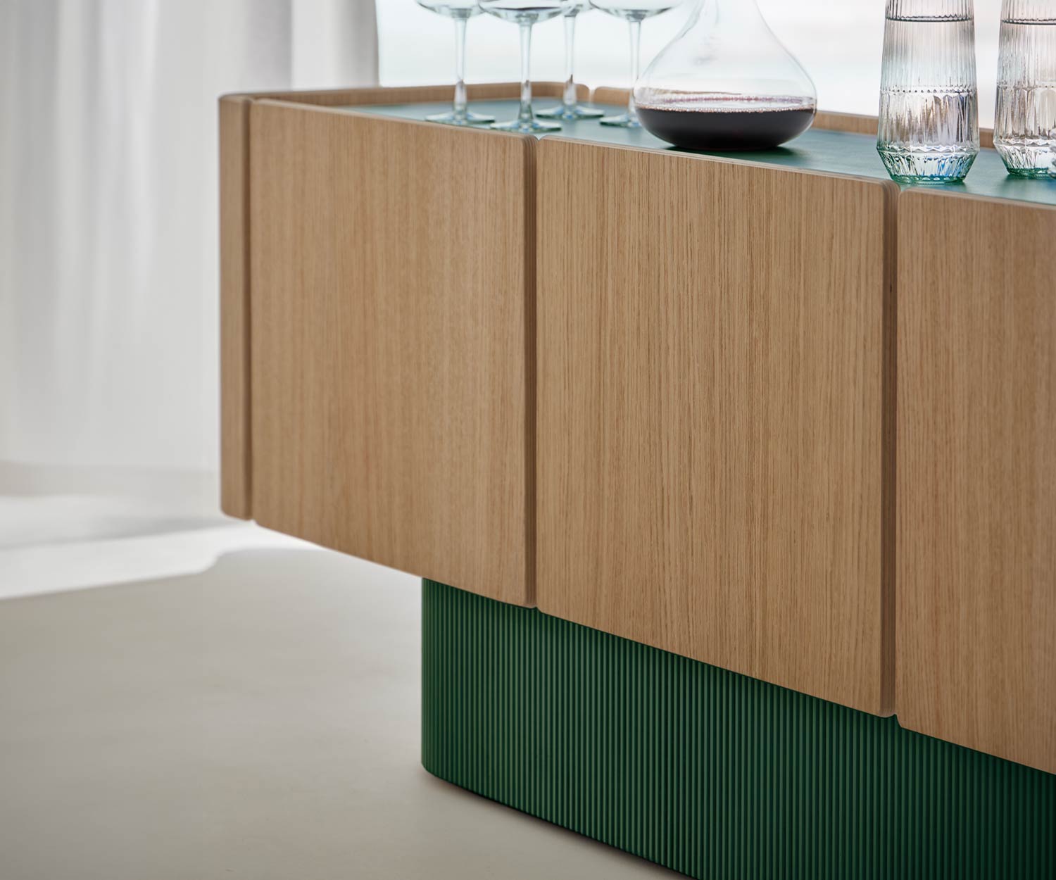 Le socle, fabriqué à partir d'un panneau de contreplaqué plaqué combiné à la même surface MDF structurée et laquée que le corps, reprend les couleurs du corps et assure la cohérence visuelle et la stabilité. Sa forme discrète renforce l'aspect flottant du sideboard et complète harmonieusement le design.
