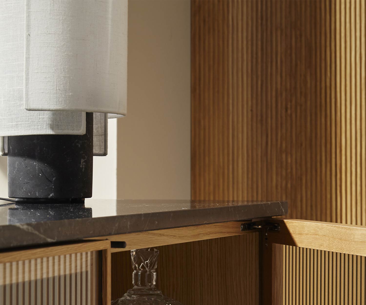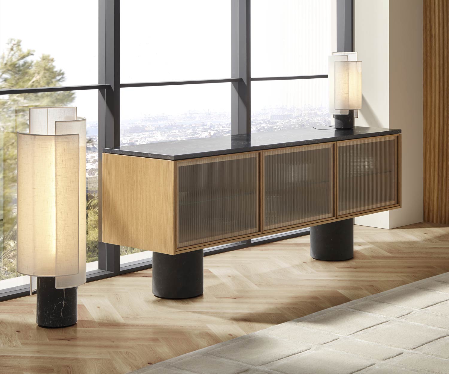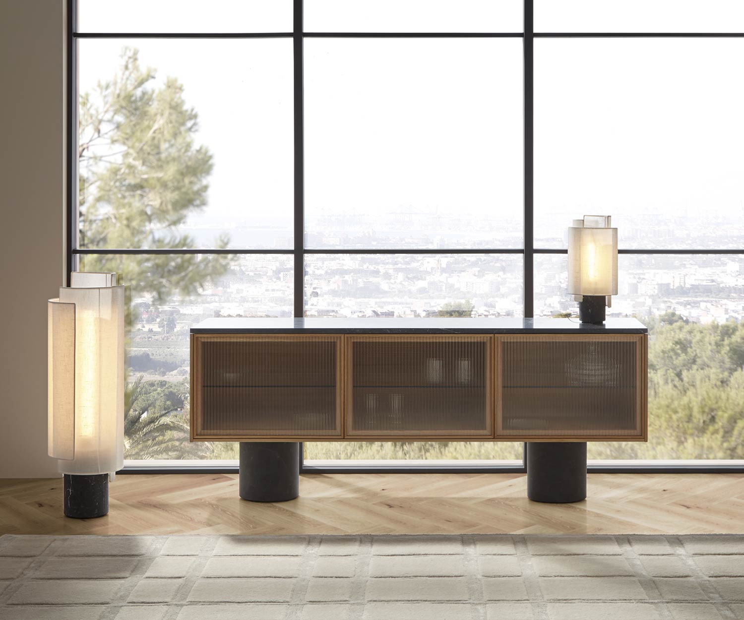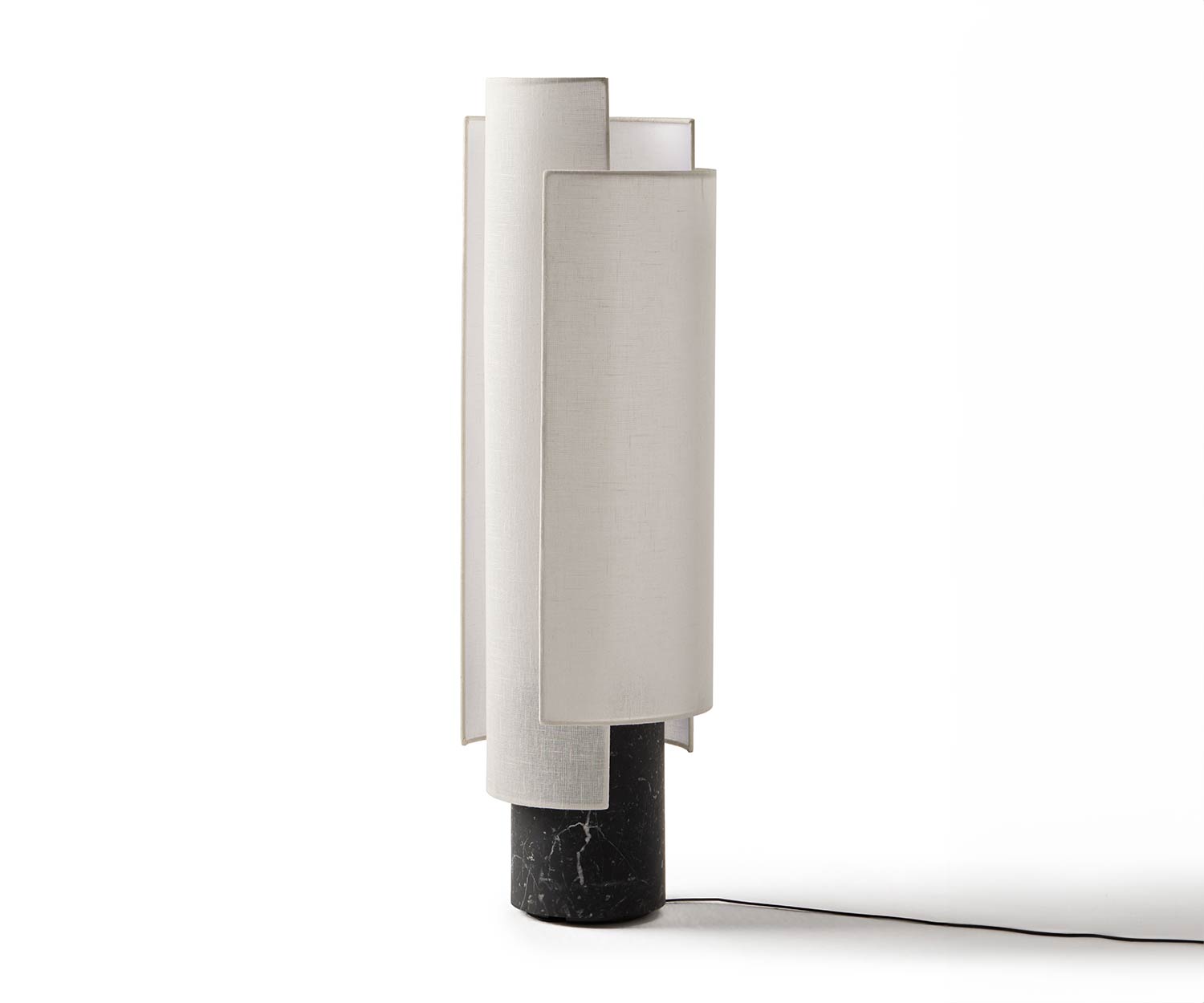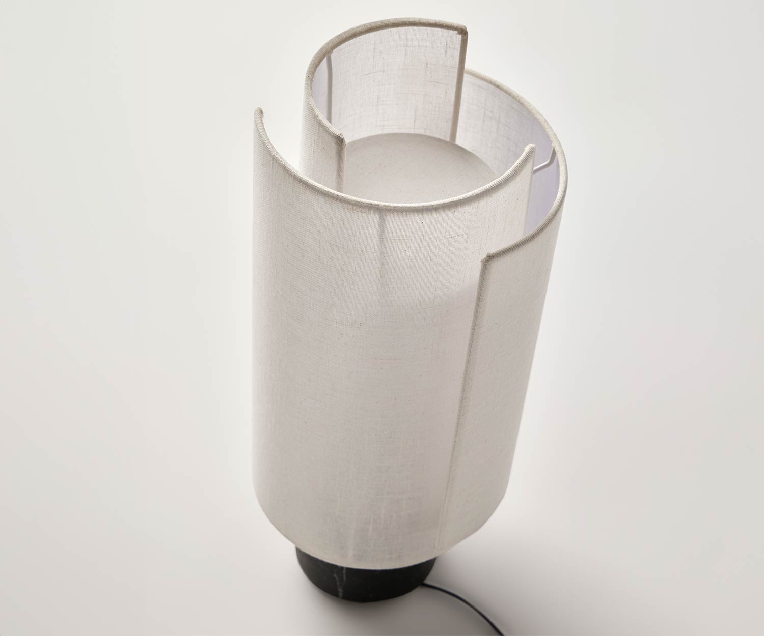 L'abat-jour est composé de cylindres avec un cadre en aluminium doré, recouvert de coton naturel. Le socle est disponible en marbre noir massif Marquina .