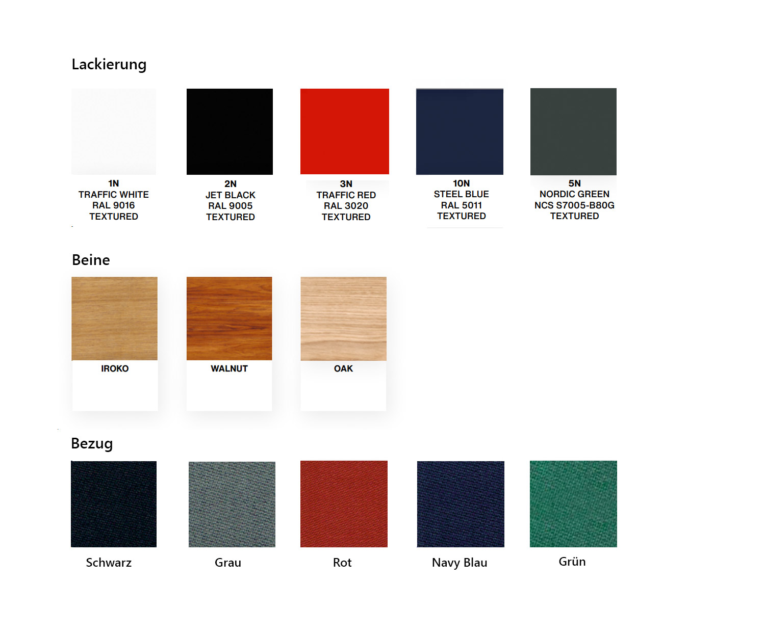 Pieds : acier avec peinture polyester et noyau iroko.