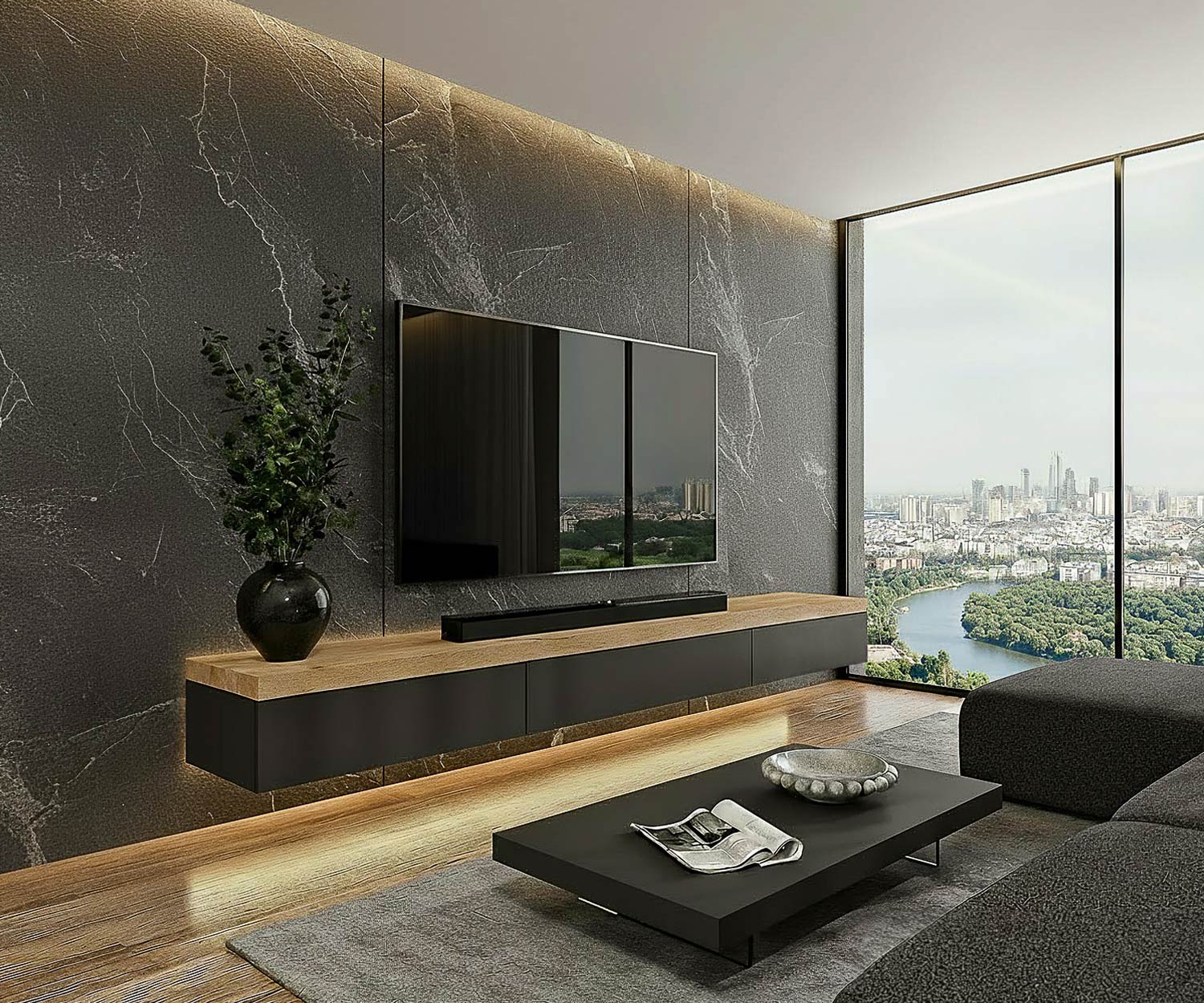 Dieses Möbelstück zieht im Wohnzimmer alle Blicke auf sich, die massive Abdeckplatte verleiht ihm eine eindrucksvolle Präsenz.