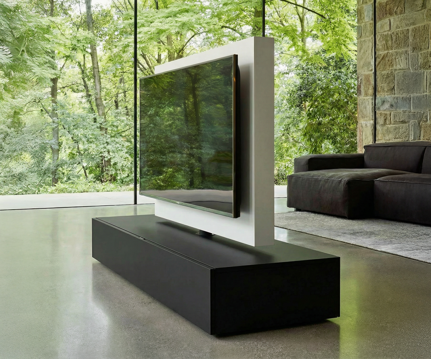 Das Besondere an diesem Design-Möbel: Es ist komplett freistehend drehbar. Die TV-Säule lässt sich um 360° schwenken, sodass Sie aus jeder Perspektive fernsehen können – egal ob vom Sofa oder vom Esstisch aus.