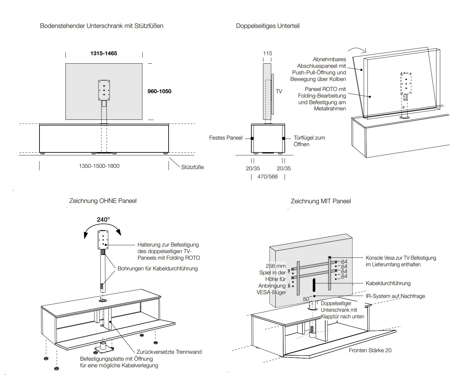 Durch Druck auf die Front kann die Klapptür geöffnet werden. Im Inneren befindet sich eine Trennwand sowie ein Rohr, welches die Kabel der Geräte im Inneren des Lowboards mit dem Fernseher verbindet. Das Rohr ist nach unten offen, so dass Kabel von außen unter dem Lowboard in das Rohr geführt werden können. Das TV Paneel kann um bis zu 360° gedreht werden. Das drehbare TV Paneel hat eine Breite von 115 cm oder 146,5 cm und kann maximal mit einem TV Gerät von bis zu 58 bzw. 65 Zoll Größe bestückt werden. An das Paneel kann eine Wunschhalterung nach Wahl gehangen werden.