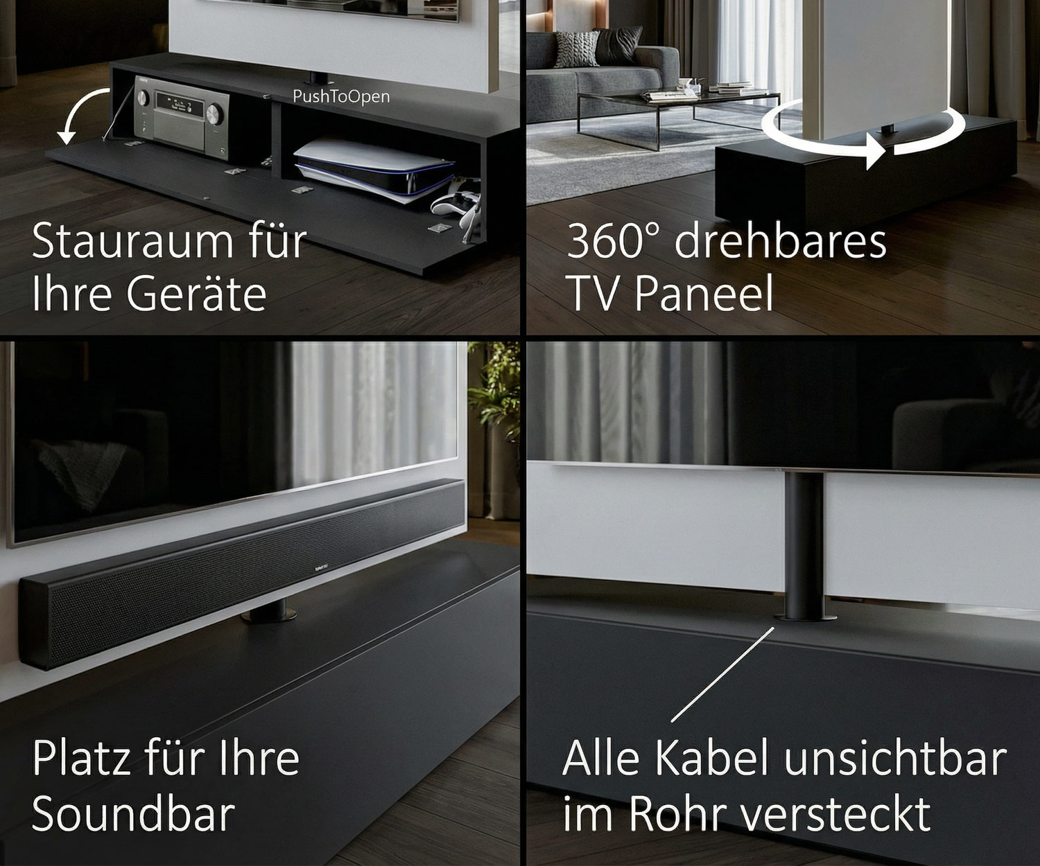 Schluss mit Kabelsalat: Im Inneren der drehbaren Säule verläuft ein intelligentes Kabelmanagement-System. Eine Trennwand und ein spezielles Rohr führen alle Kabel vom Fernseher unsichtbar nach unten in das Lowboard. Das Rohr ist nach unten offen, sodass Sie Strom- und Signalkabel ganz einfach von außen unter dem Möbelstück zuführen können.