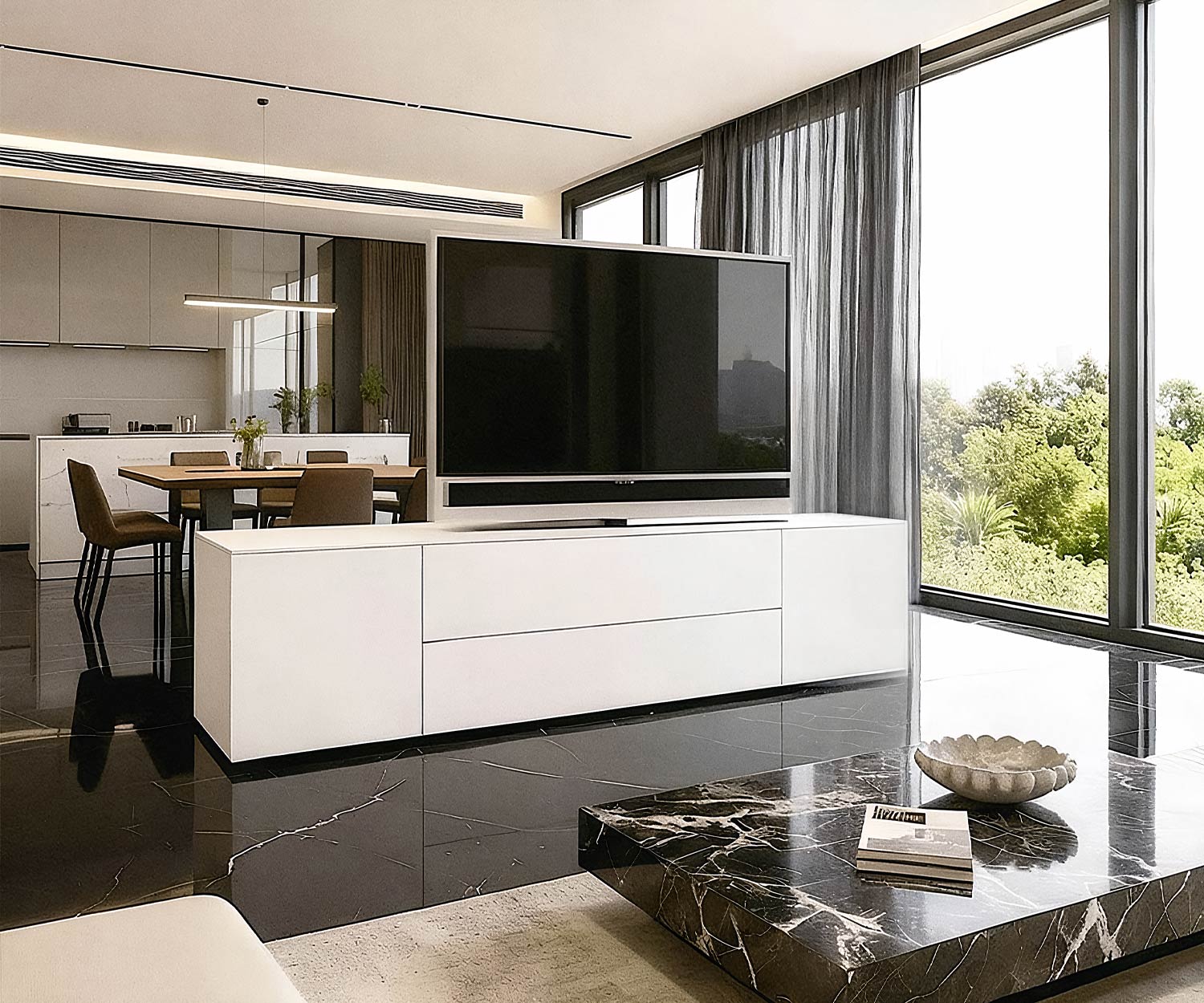 Erhältlich ist das Sideboard in Weiß Matt (RAL9016) oder Schwarz Matt (RAL9011), während TV-Paneel stets in Weiß Matt gefertigt werden. Auf Wunsch sind auch individuelle Sonderfarben möglich. Ein echtes Designerstück aus Italien, das Funktionalität, Qualität und zeitlose Ästhetik vereint.