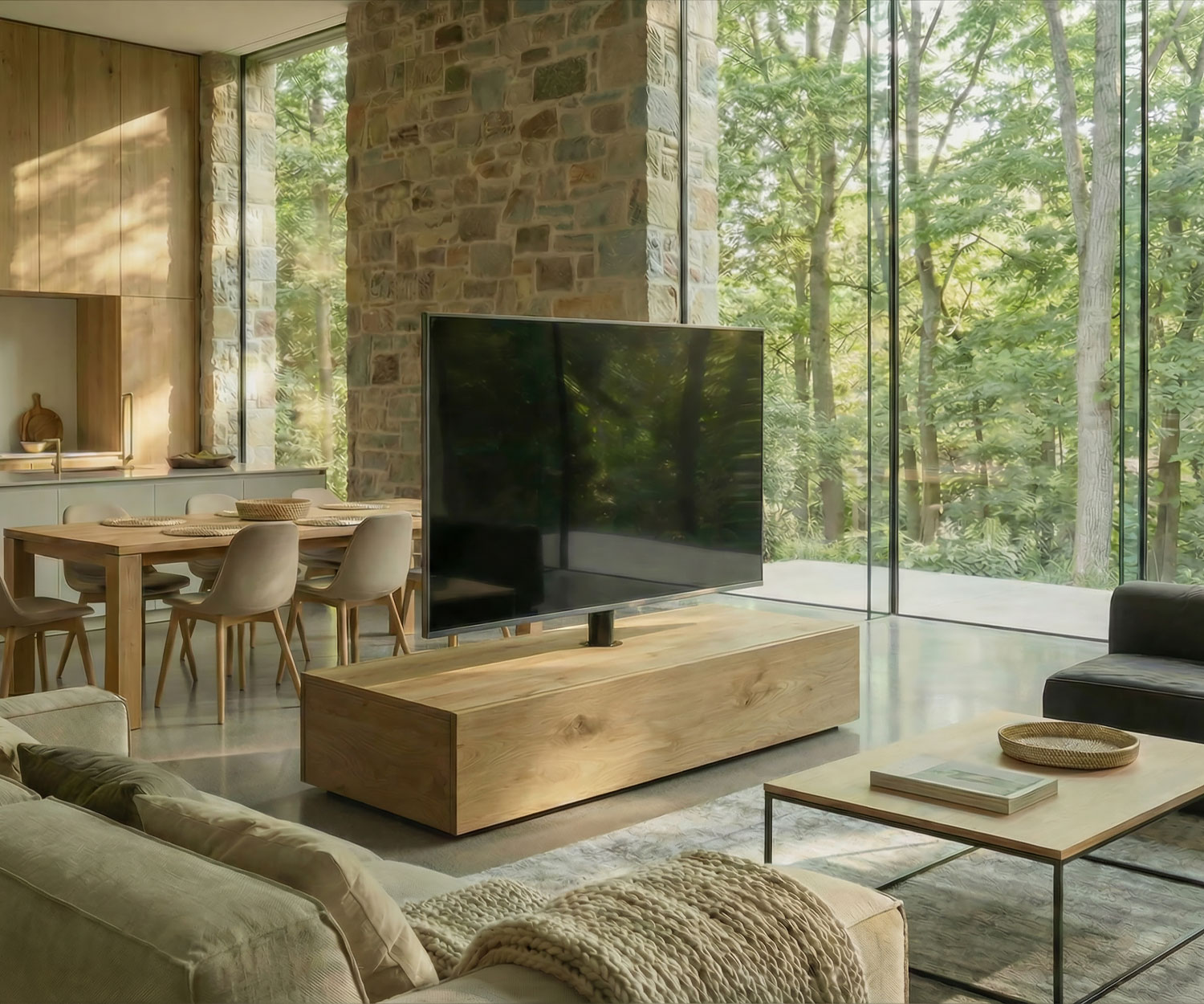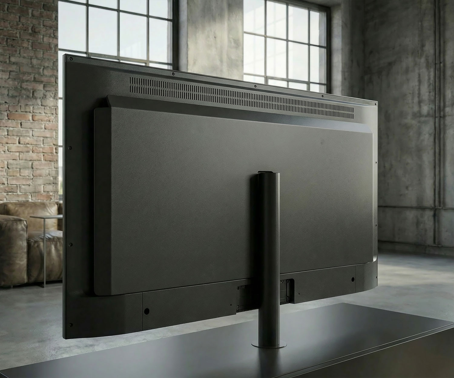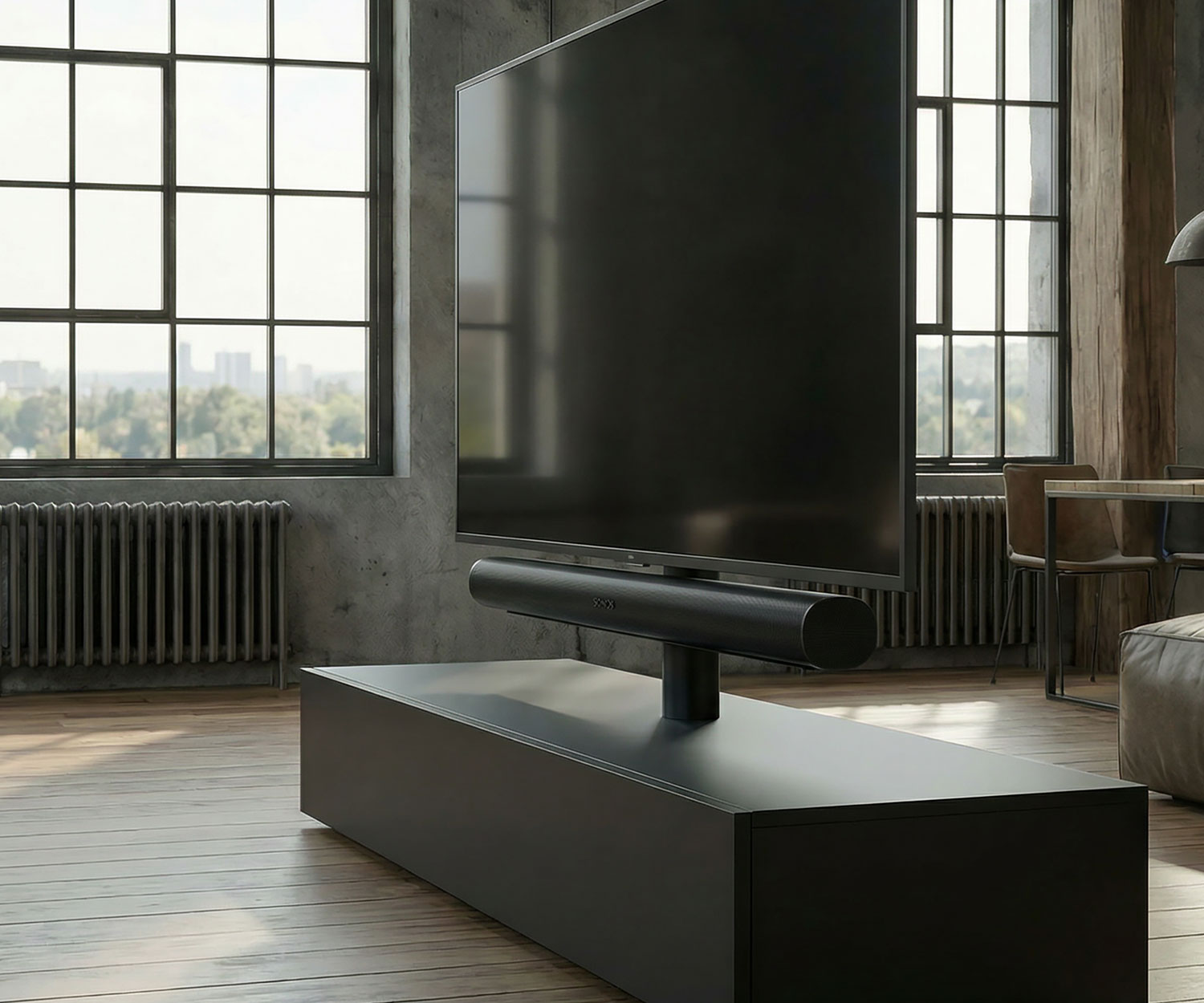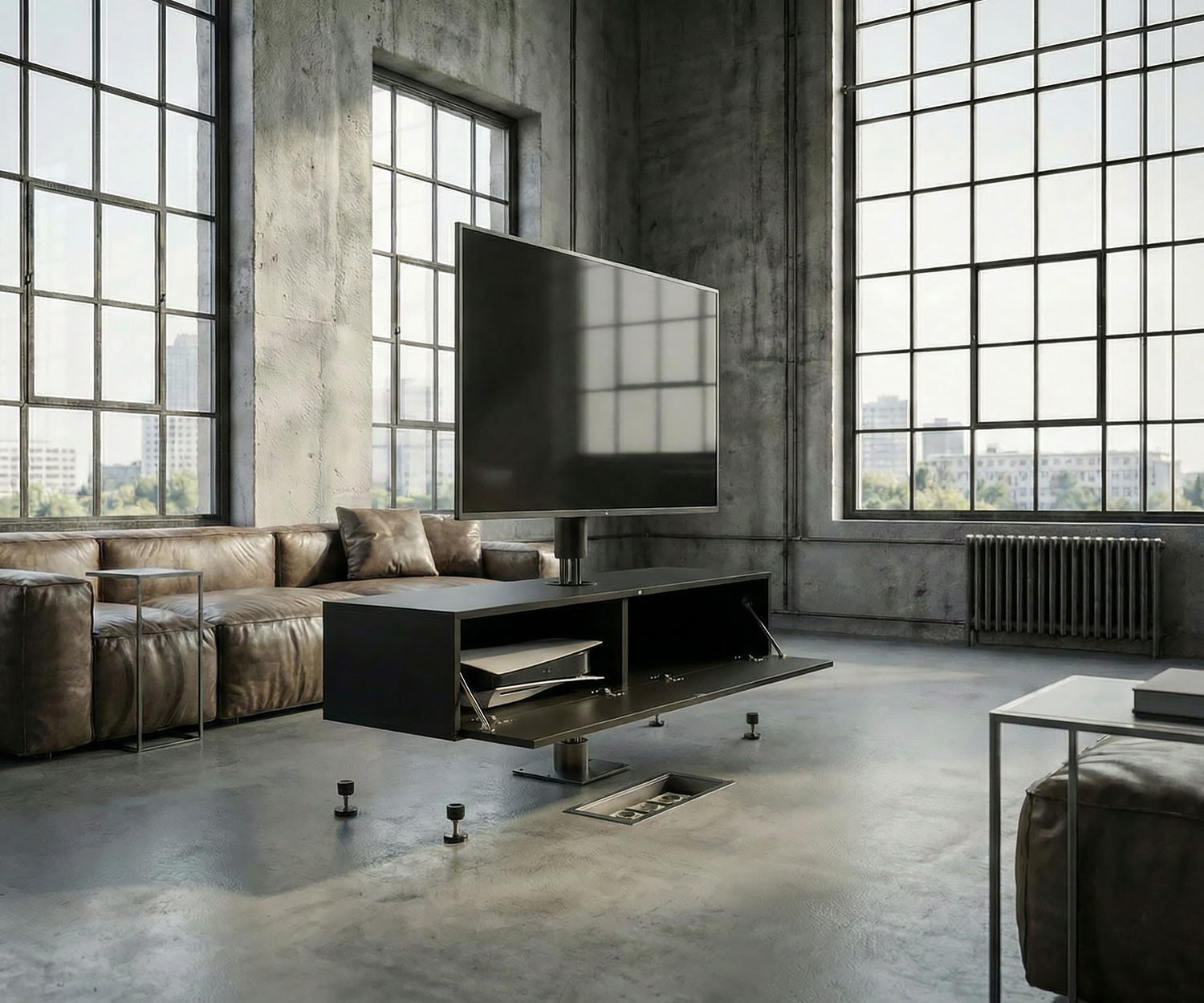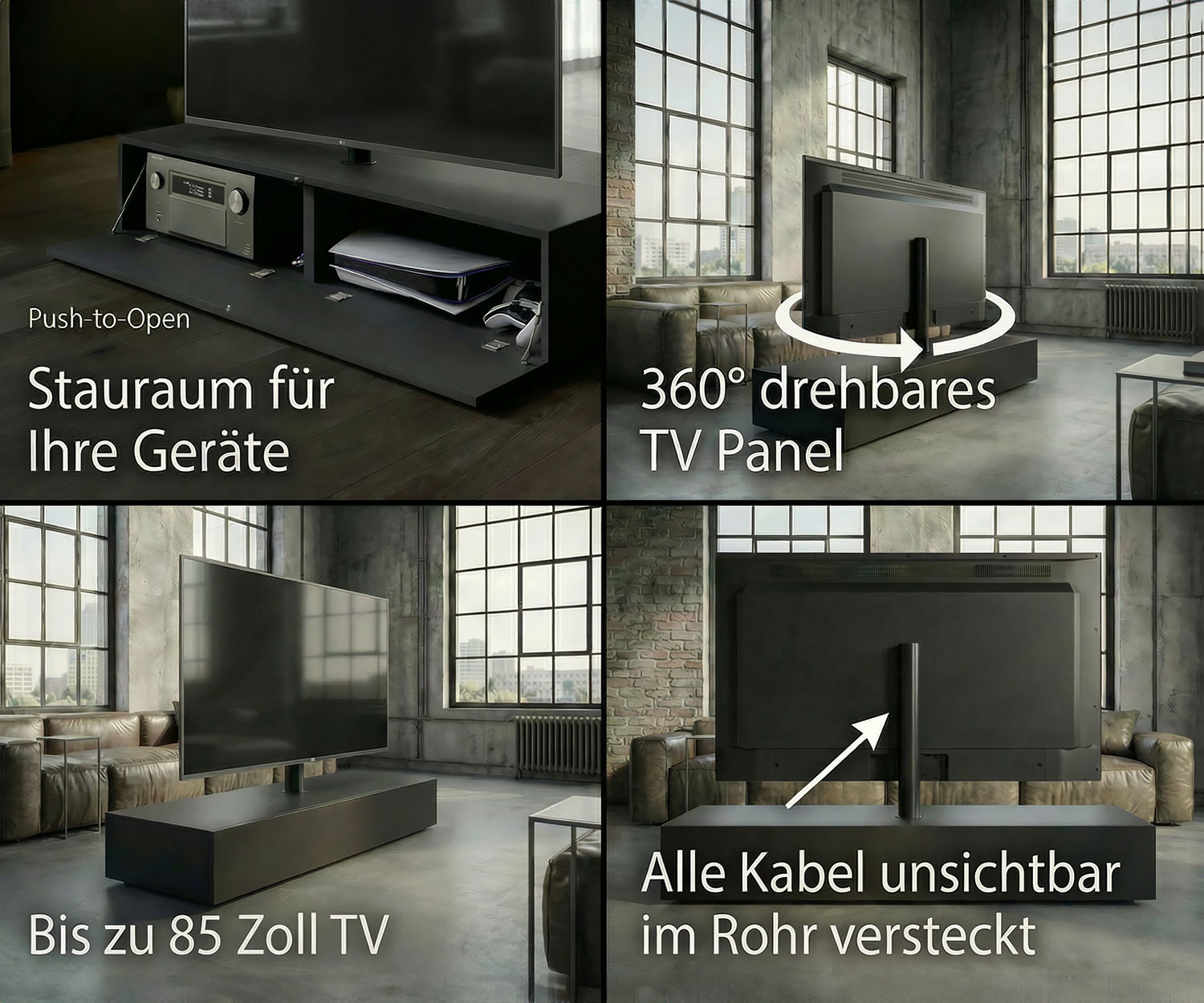 Das absolute Highlight des Roto Slim ist seine integrierte TV-Säule, die Funktionalität neu definiert. Die Konstruktion wurde gezielt verstärkt und trägt nun problemlos Großbildschirme jenseits der 65 Zoll.