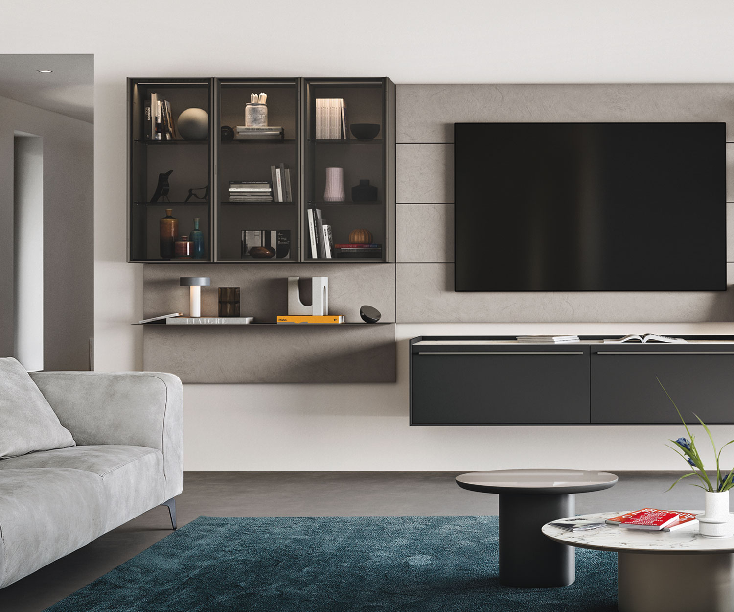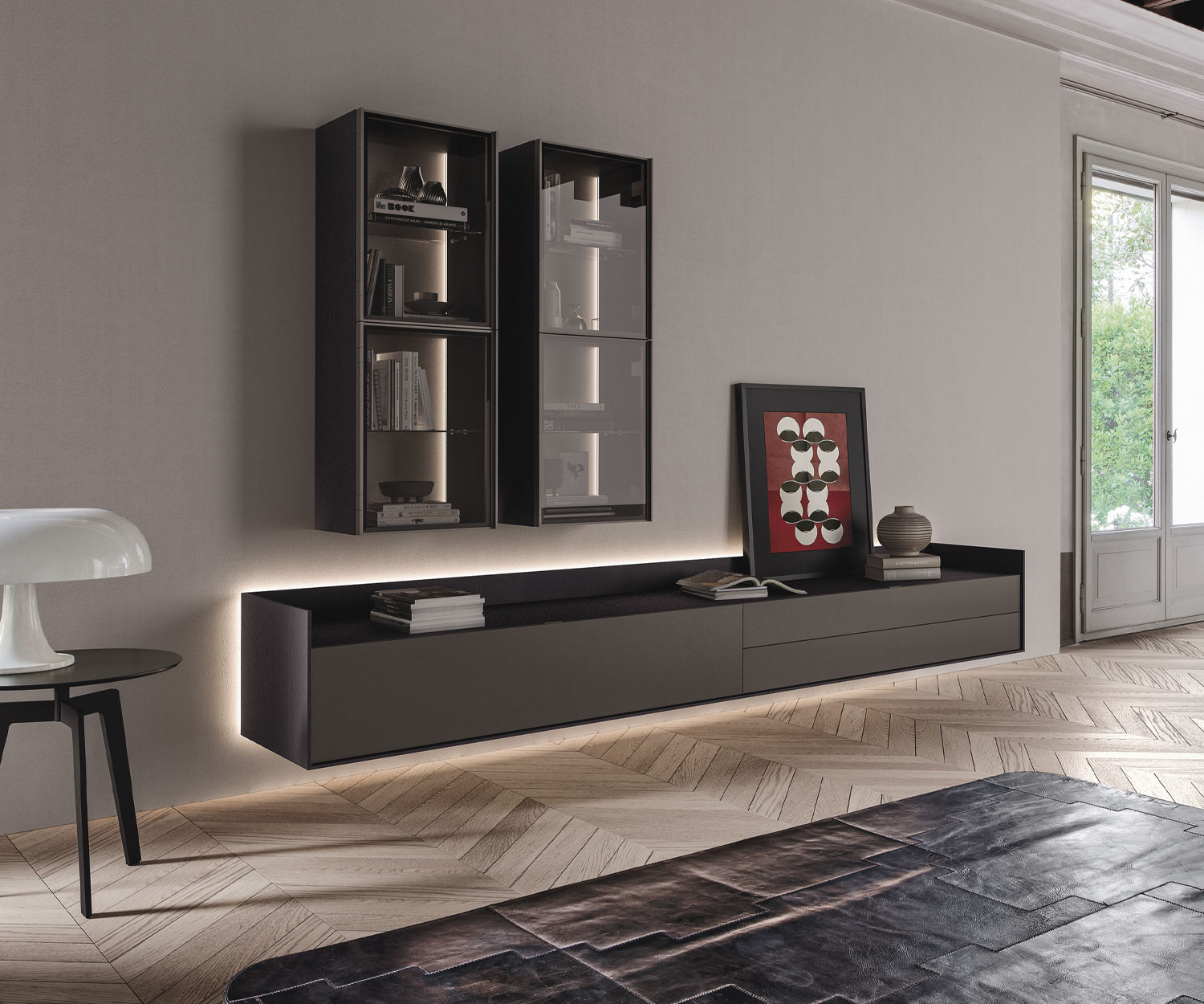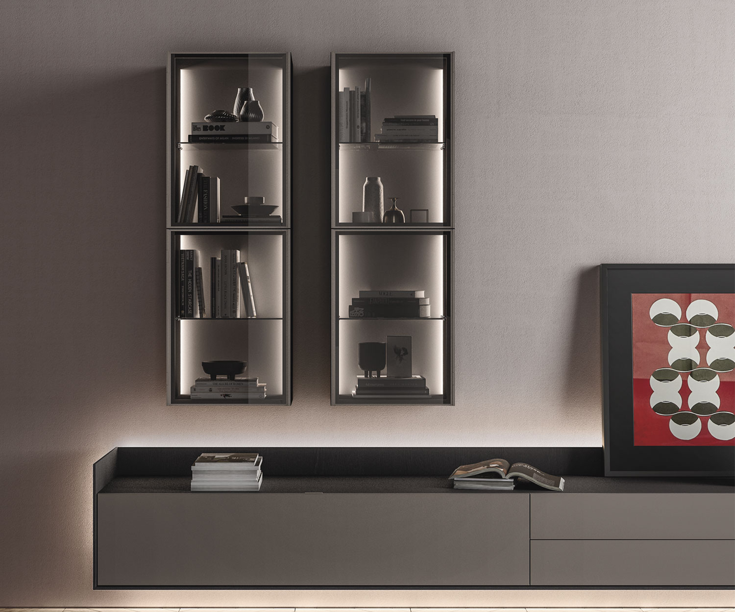 Die moderne hängende Livitalia Design Glasvitrine Scrigno wird nur auf Bestellung für Sie in Italien gefertigt. Die Glasvitrine überzeugt durch große Glastüren mit schmalem Rahmen. Erhältlich ist die Vitrine in verschiedenen Modulbreiten (siehe Skizze), die miteinander zu einer beliebig breiten Variante (wie Abb.) kombiniert werden können. Bis zu einer Breite von 300 cm kann eine durchgehende Abdeckplatte verwendet werden. Die Türen verfügen über 180° Scharniere, die einen bequemen Zugang zum Innenleben erlauben.