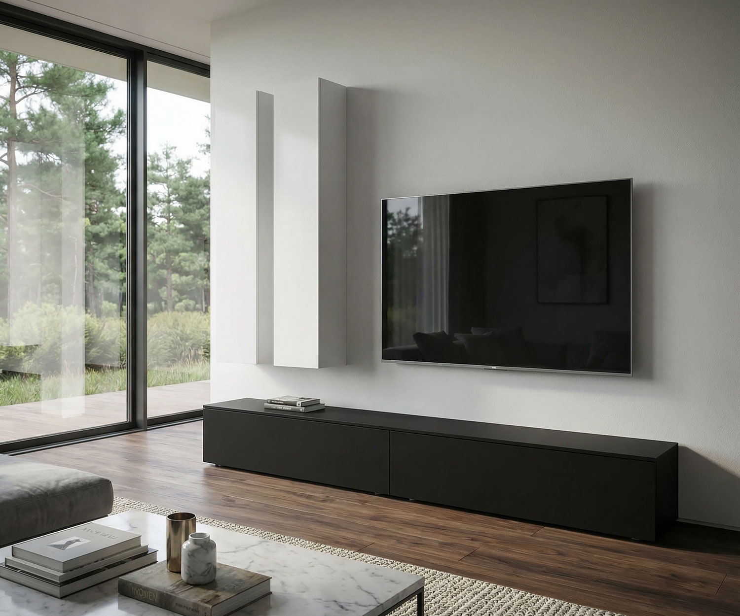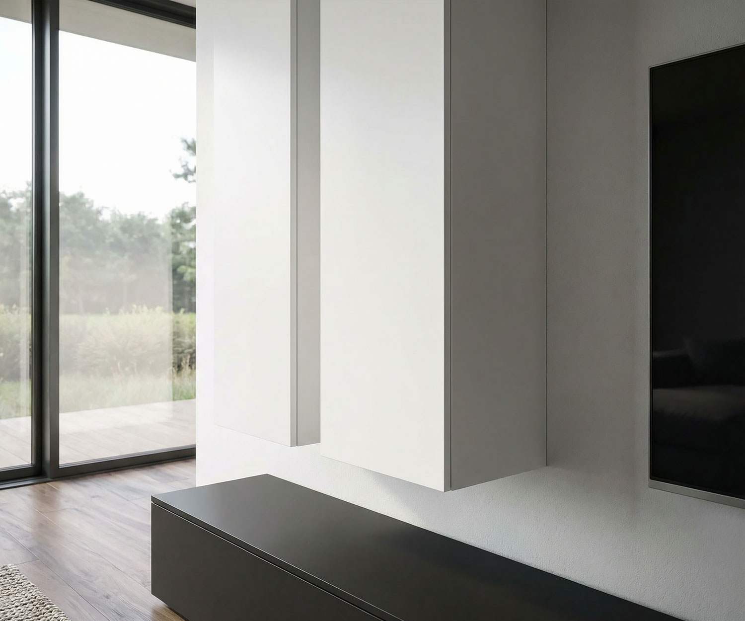 Das Lowboard ist in Matt Schwarz(RAL 9011) erhältlich. Die Hängeschränke sind in Weiß (RAL9016) matt lackiert und überzeugen durch eine samtige Oberfläche.