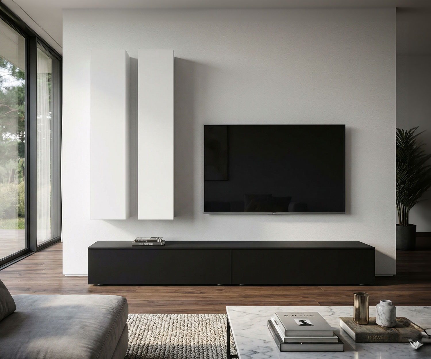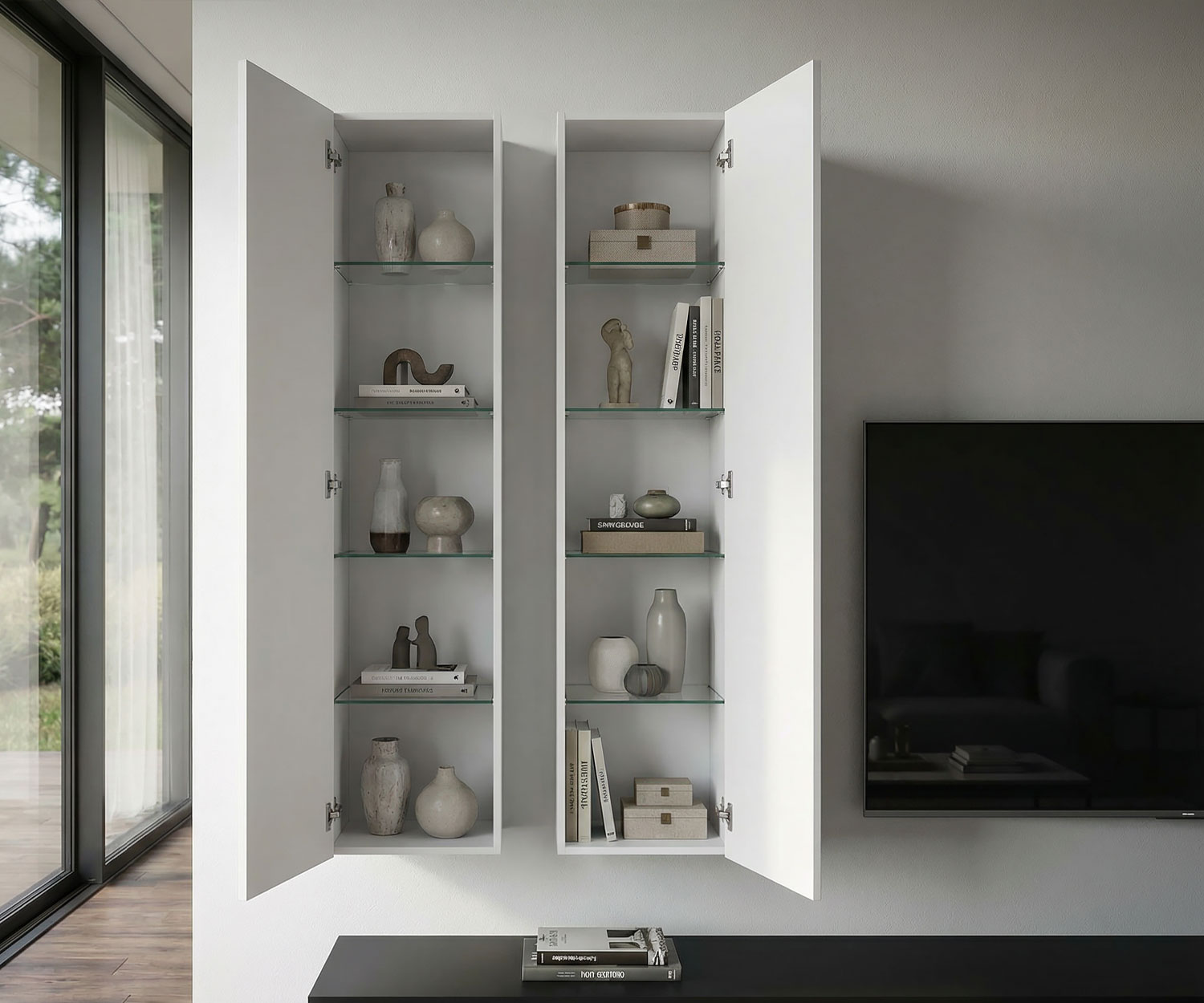 Die Kombination aus geräumigem Box Lowboard und schwebenden Wandschränken bietet Ästhetik und Stauraum in Perfektion. Exklusiv für Sie in Italien gefertigt.