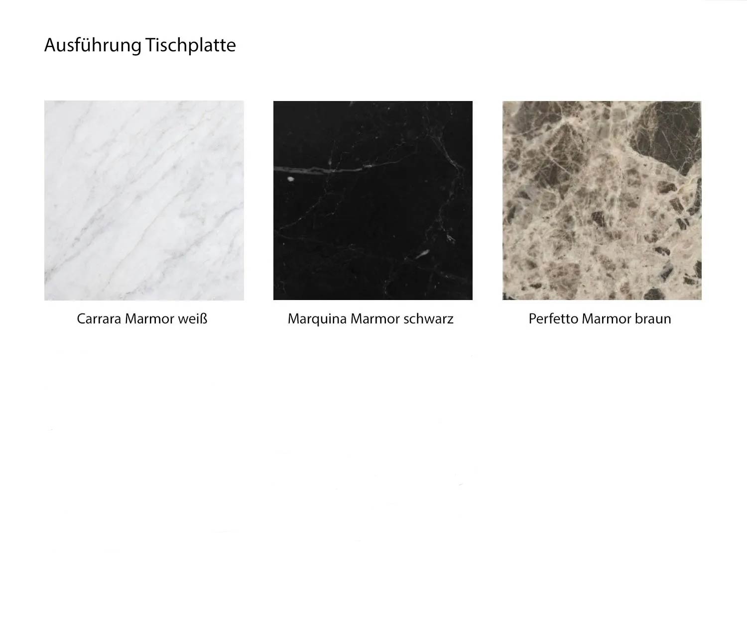 Die Tischplatte des Marelli Break Esstisches gibt es aus Marmor in Carrara Weiß, Marquina Schwarz oder Perfetto Braun. Die Füße des Untergestells sind in den Farben Schwarz Matt (RAL 9017), Silber Chrom glänzend oder Messing Chrom glänzend erhältlich.