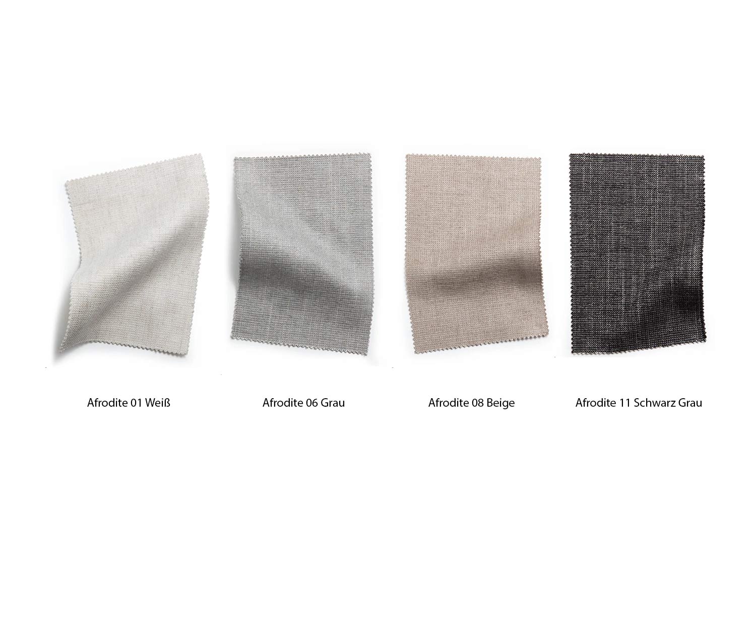 Der Stoffbezug Afrodite besteht aus 40% Viskose, 24% Baumwolle, 23% Polyester und 13% Leinen