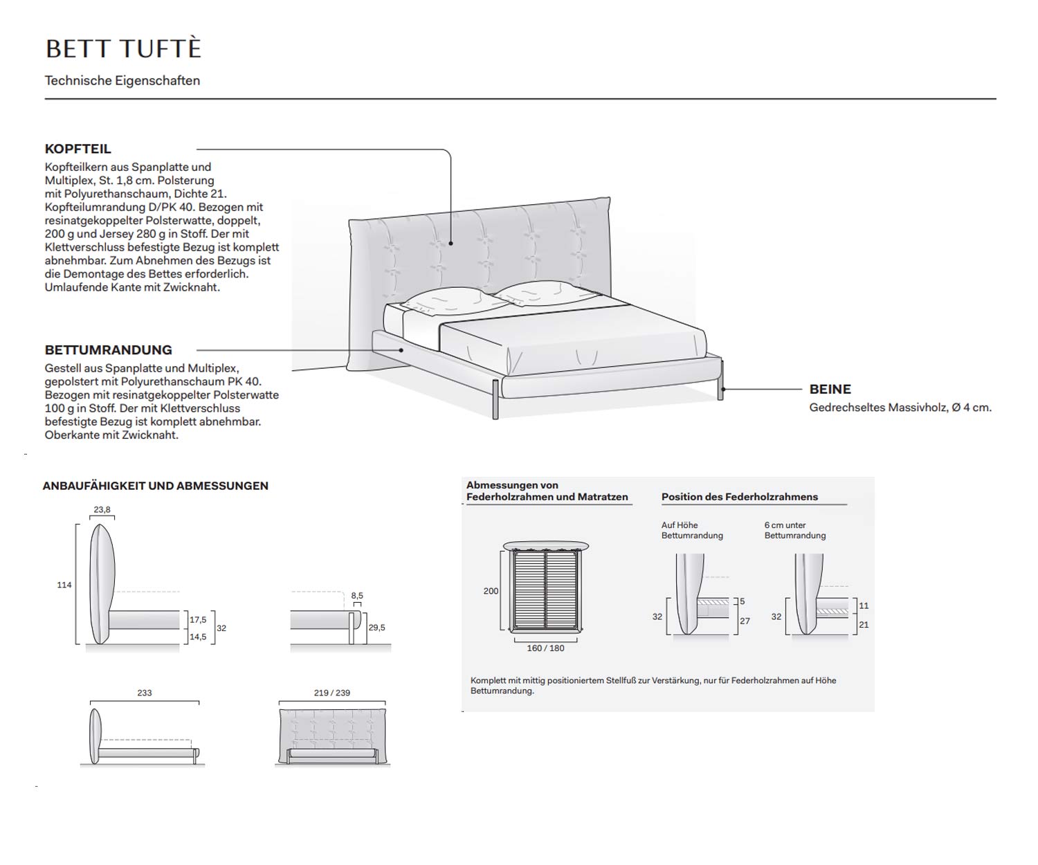 Das Kopfteil und die Bettumrandung des Novamobili Bettes Tufte bestehen aus Multiplex (fünf miteinander verleimte Furnierschichten) sowie Spanplatte und enthalten eine Polsterung aus Polyurethanschaum. Die Kopfteilumrandung ist bezogen mit resinatgekoppelter Polsterwatte.