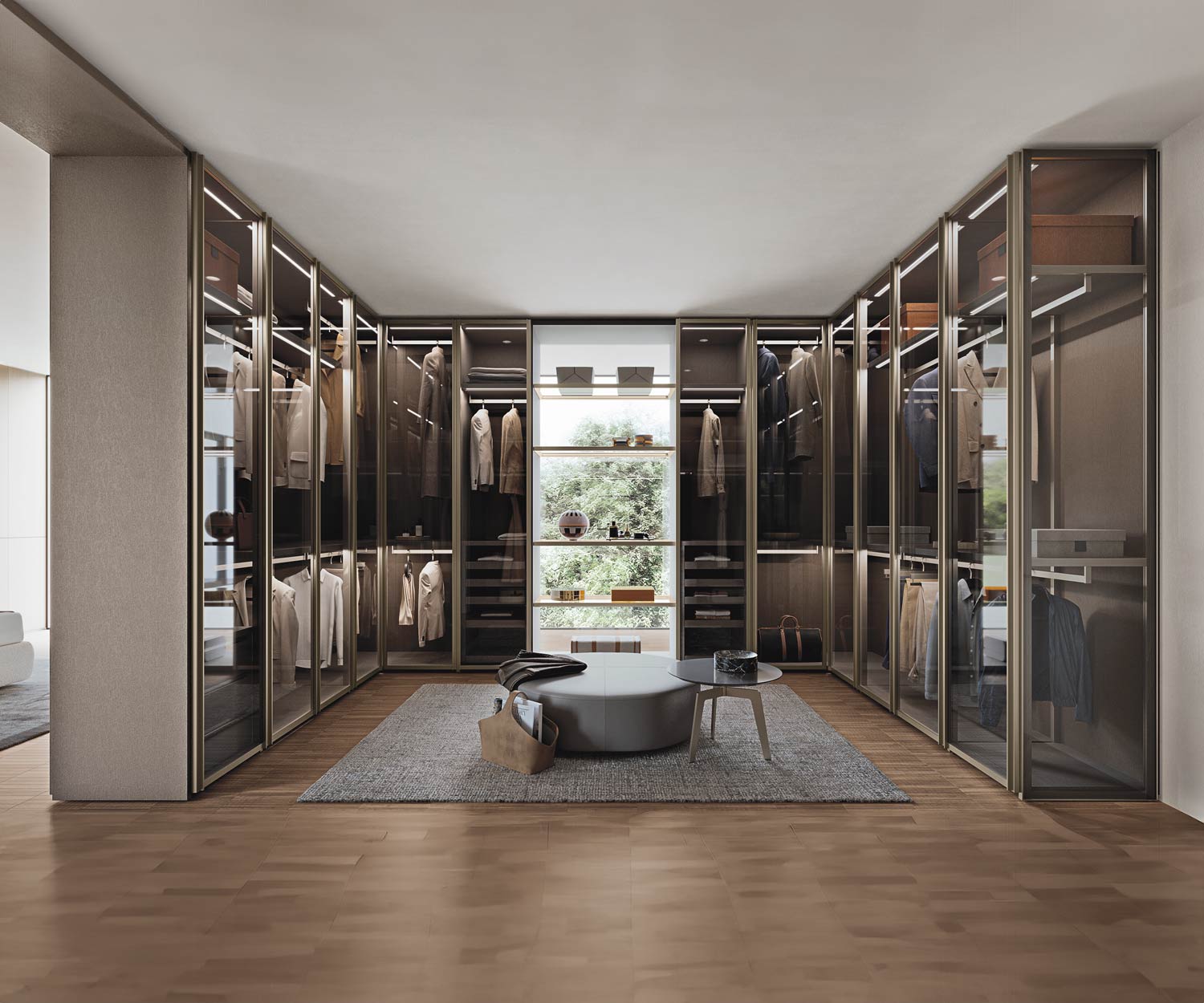 Perry ist ein extravaganter Design Kleiderschrank mit transparenten Glastüren. Nur auf Bestellung wird der Kleiderschrank mit Glastüren für Sie in Italien gefertigt. Zur Auswahl stehen 8 Standardbreiten von 152 cm bis 402 cm. Die durchsichtigen Glastüren sind aus leicht getönt Rauchglas und geben der Kleidung im Inneren einen luxuriösen Touch. Die Metallrahmen der Glastüren sind braun brüniert und besonders schlank. So wird der Blick auf die Kleidung nicht behindert. Mit einer optionalen Innenraumbeleuchtung kommt der Glastüren Kleiderschrank besonders gut zu Geltung und wird zum Highlight im Schlafzimmer.