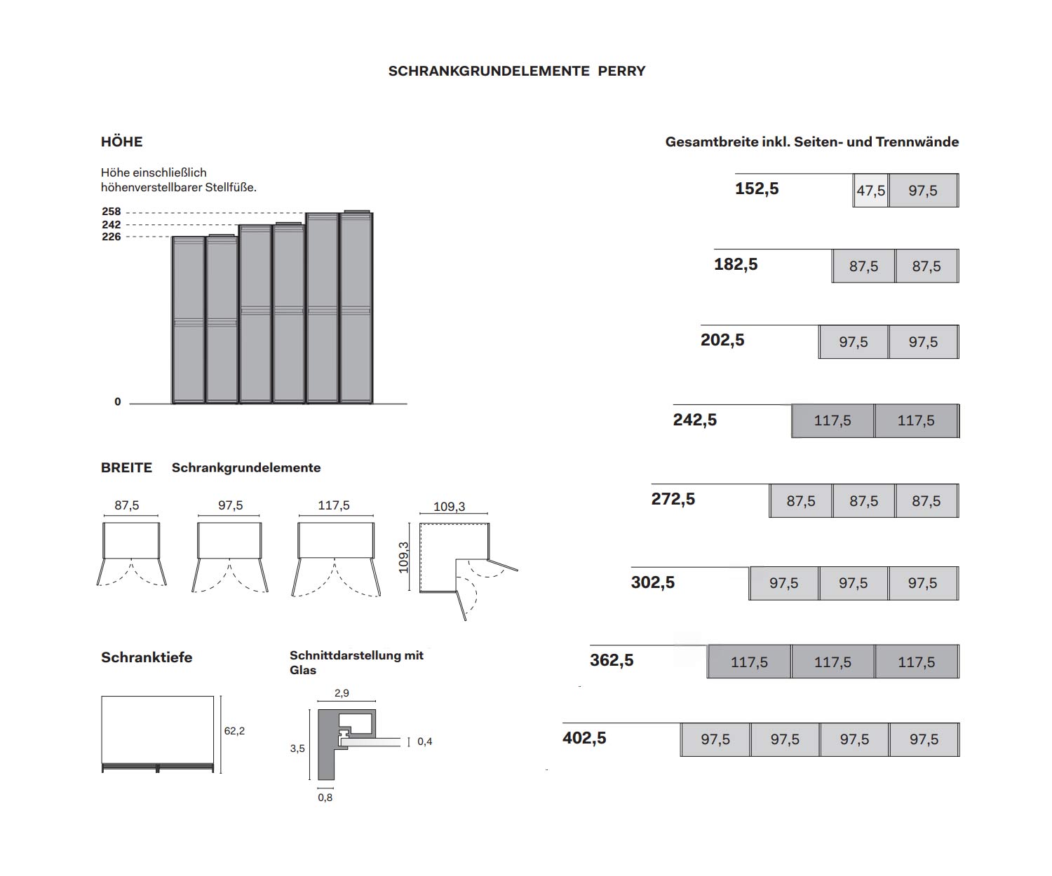 B 242,5 cm / H 258 cm / T 60,9 cm – 4 Flügeltüren (Innenraumbreite: 2x 117,5)
