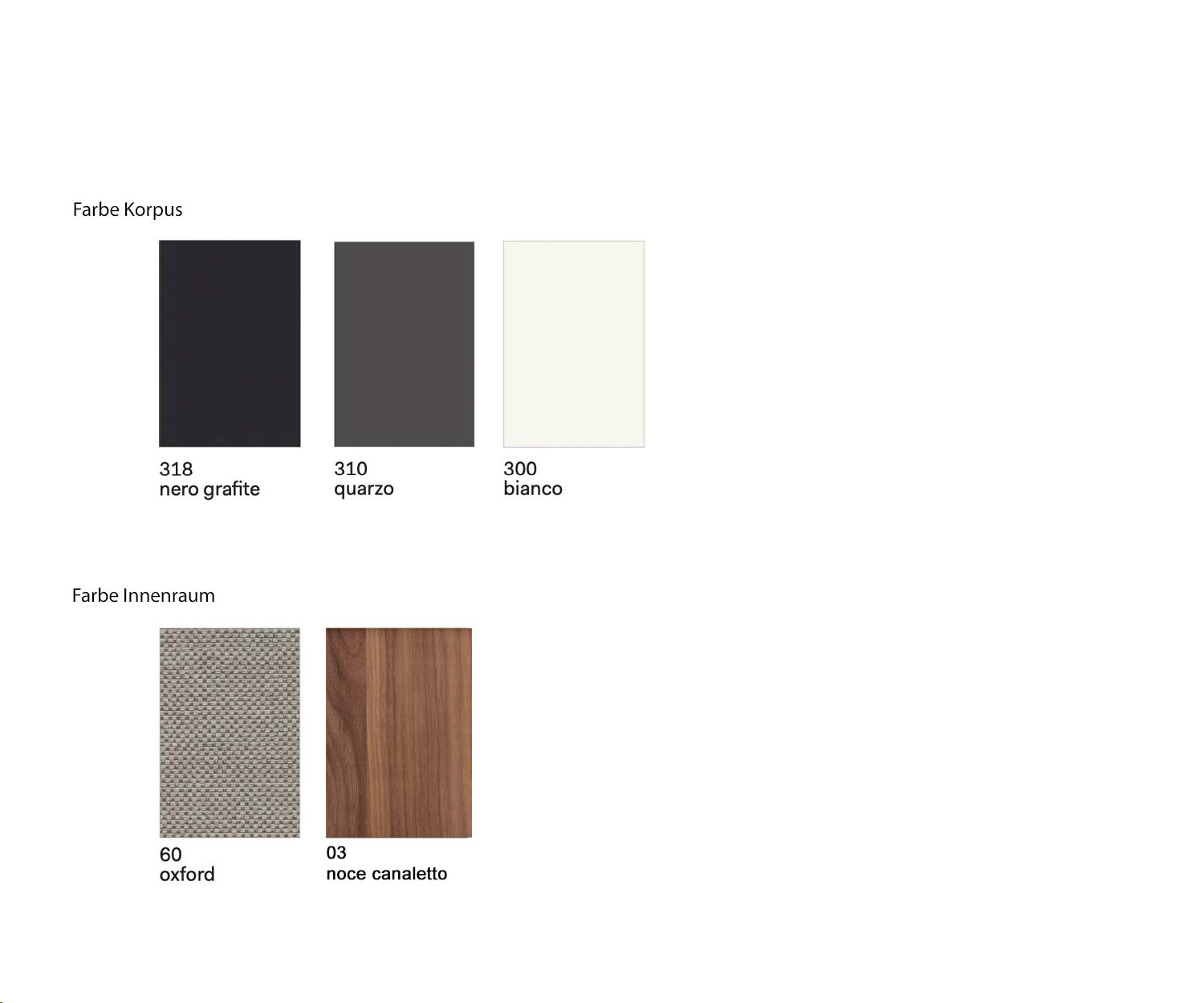 Der Novamobili Perry Design Kleiderschrank mit Glastüren wird immer mit transparenten, aber leicht getönten Rauchglas Glastüren geliefert. Der Korpus kann wahlweise in 3 matten Farben lackiert werden. Zur Auswahl stehen: Weiß (ähnlich RAL9003), Schwarz (ähnlich RAL9017), Quarzo (Dunkelgrau, ähnlich RAL7016). Der Innenraum ist in Oxford Grau oder Nussbaum Lignum ausgeführt. Die Oberfläche ist leicht strukturiert und somit kratzunempfindlicher. Die Kleiderstangen sind braun brüniert.