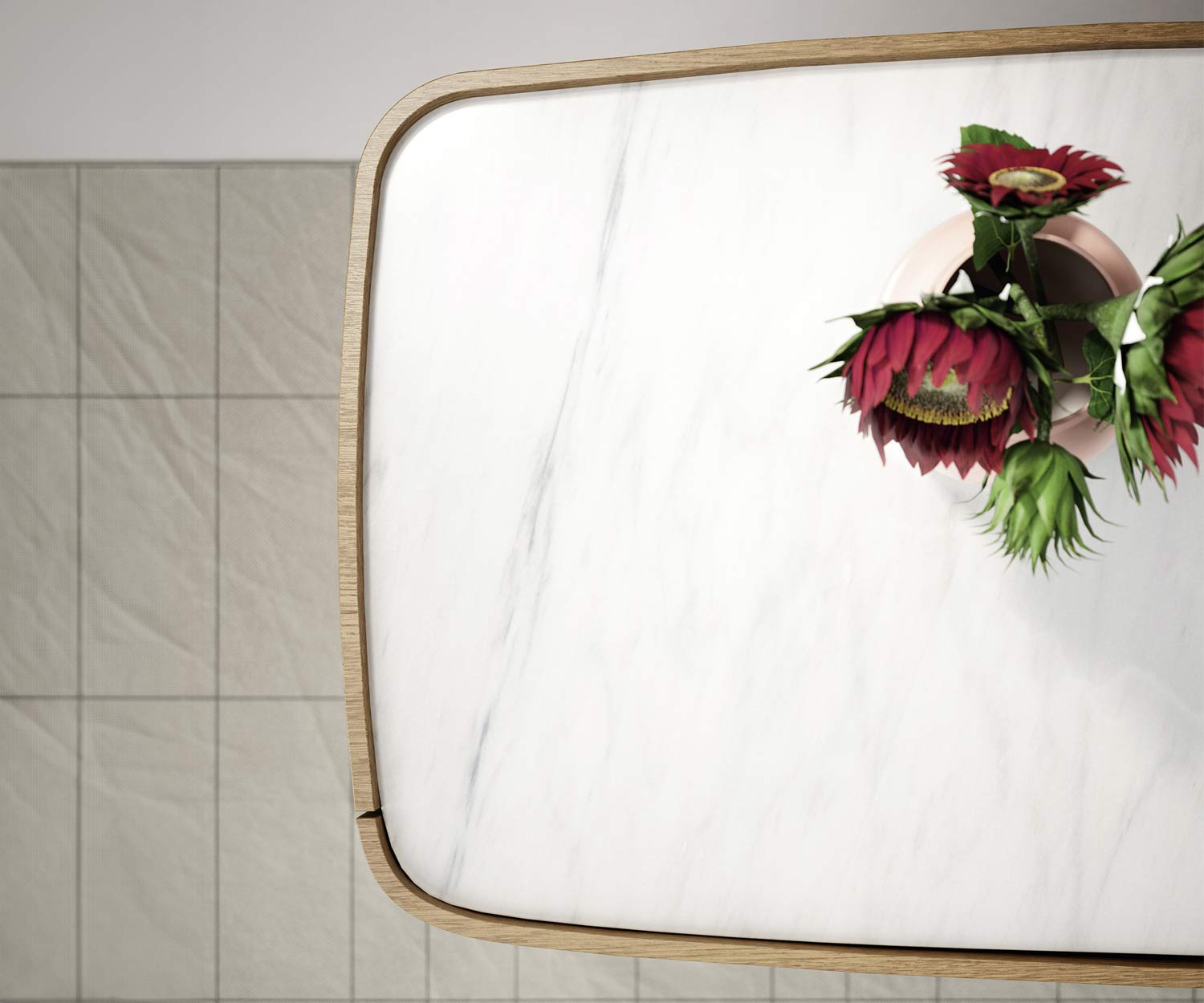 Der Korpus und die Fronten werden aus 19mm starken gerundeten Spanplatten hergestellt. Anschließend werden alle Flächen mit einem gebürstetem Echtholzfurnier veredelt. Bei der optionalen Abdeckplatte handelt es sich um den weltberühmten Carrara-Marmor.