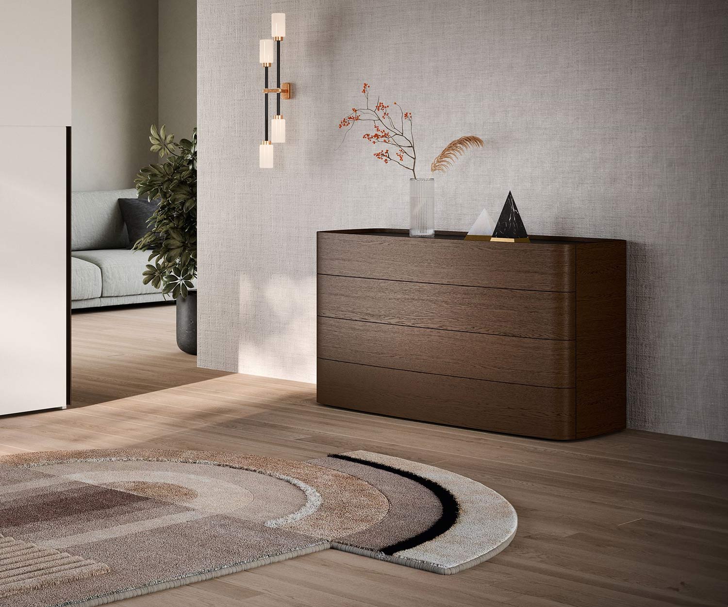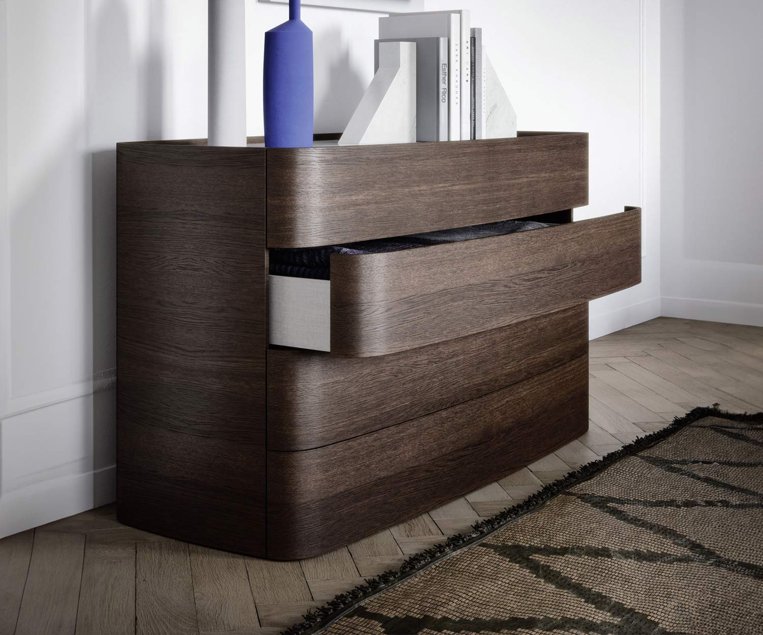 Die Schlafzimmer Design Kommode Norman wird vom Hersteller Novamobili in Italien produziert. Ein besonderes Designmerkmal sind die abgerundeten Ecken und das natürliche Eichenfurnier. Optional erhalten Sie die Kommode auch mit einer 12 mm starken Abdeckplatte aus dem weltberühmten Carrara-Marmor.