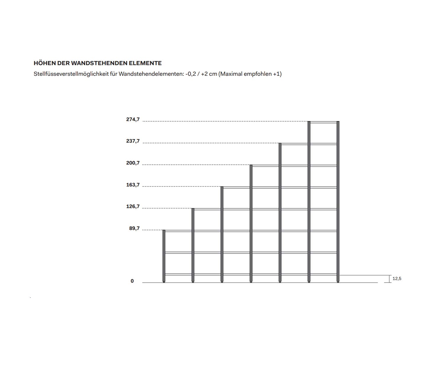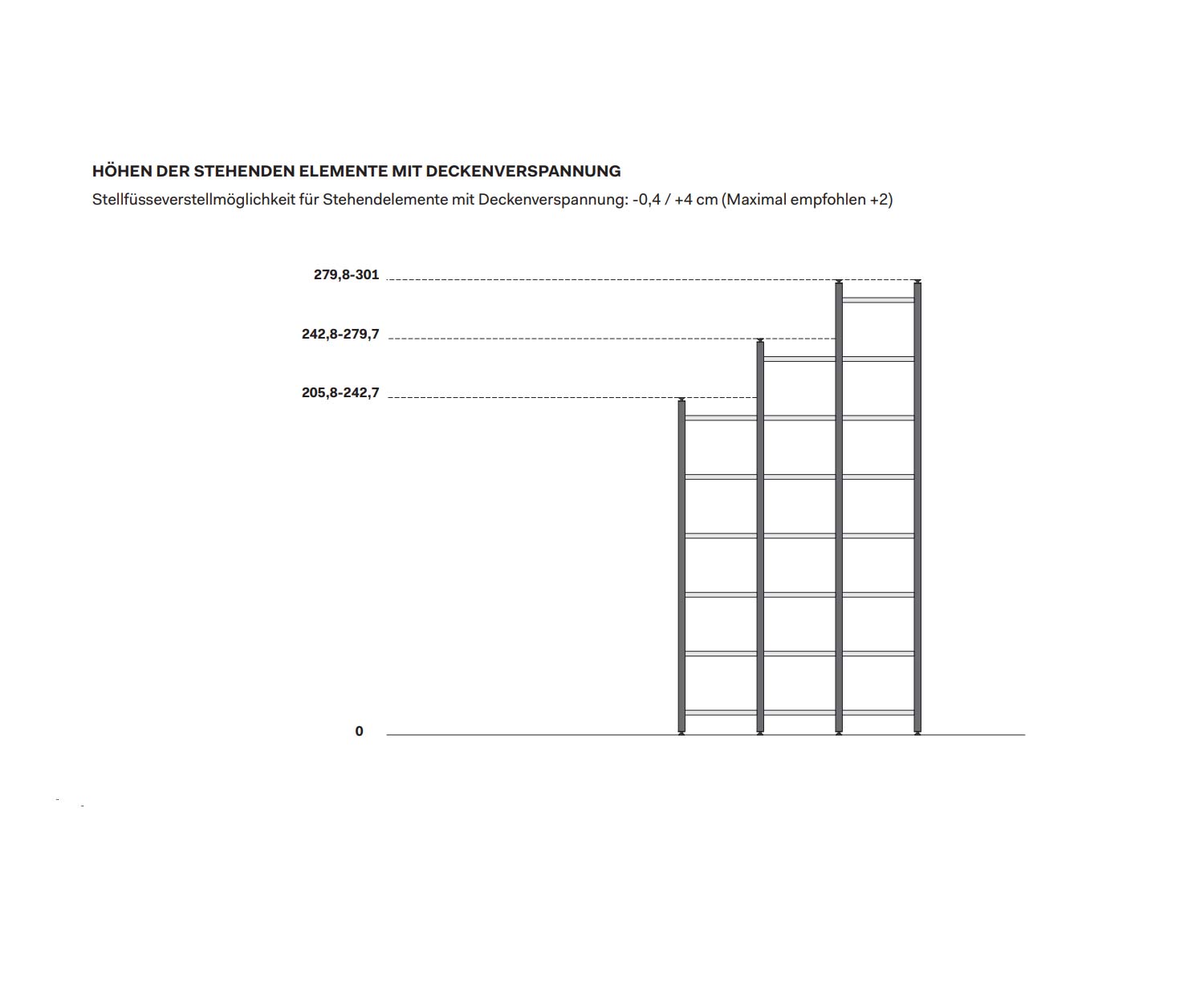 Folgende Höhen sind möglich: 89,7 – 126,7 – 163,7 – 200,7 – 237,7 – 274,7 cm
