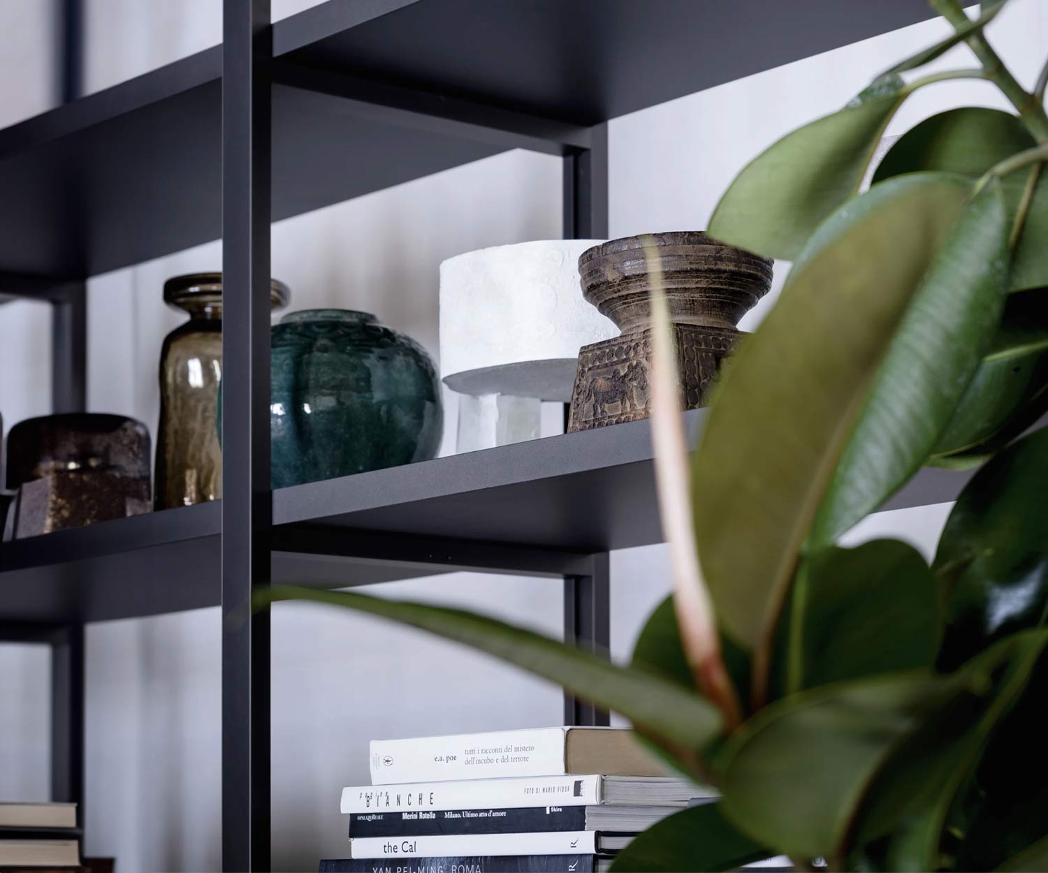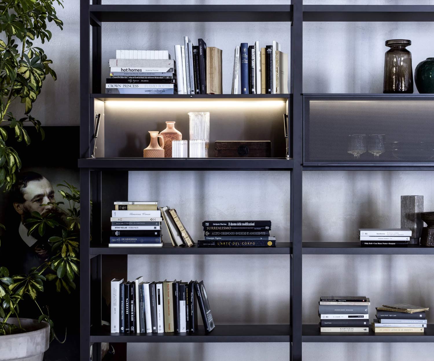 Modernes Standregal Pontile aus Metall. Das Regalsystem wird nur auf Bestellung von Novamobili in Italien gefertigt. Auf Anfrage konfigurieren wir Ihre Wunschregalgröße.