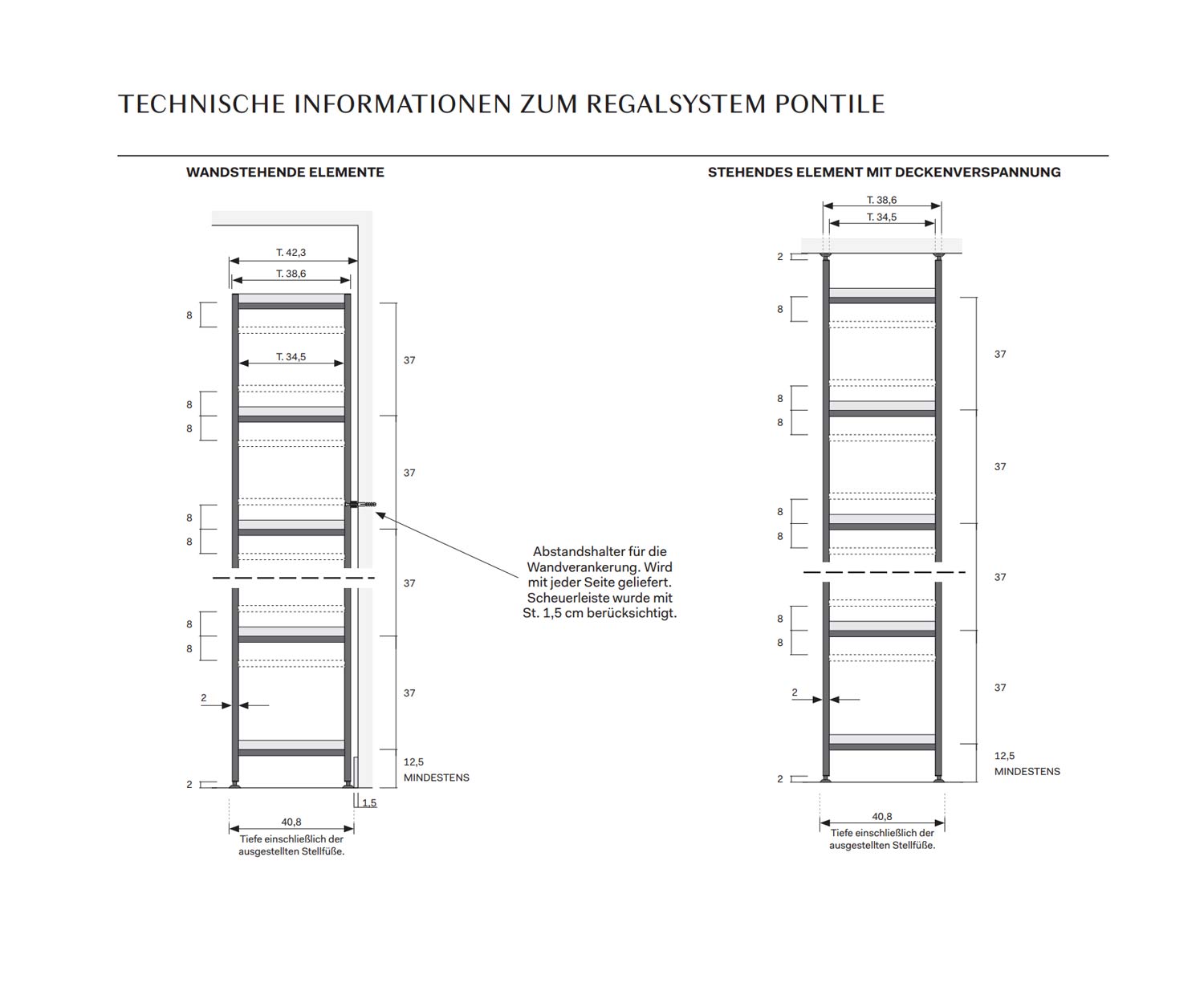 Das Regal kann an die Wand gestellt werden oder mit einer Deckenverspannung zwischen Decke und Boden mitten im Raum montiert werden.