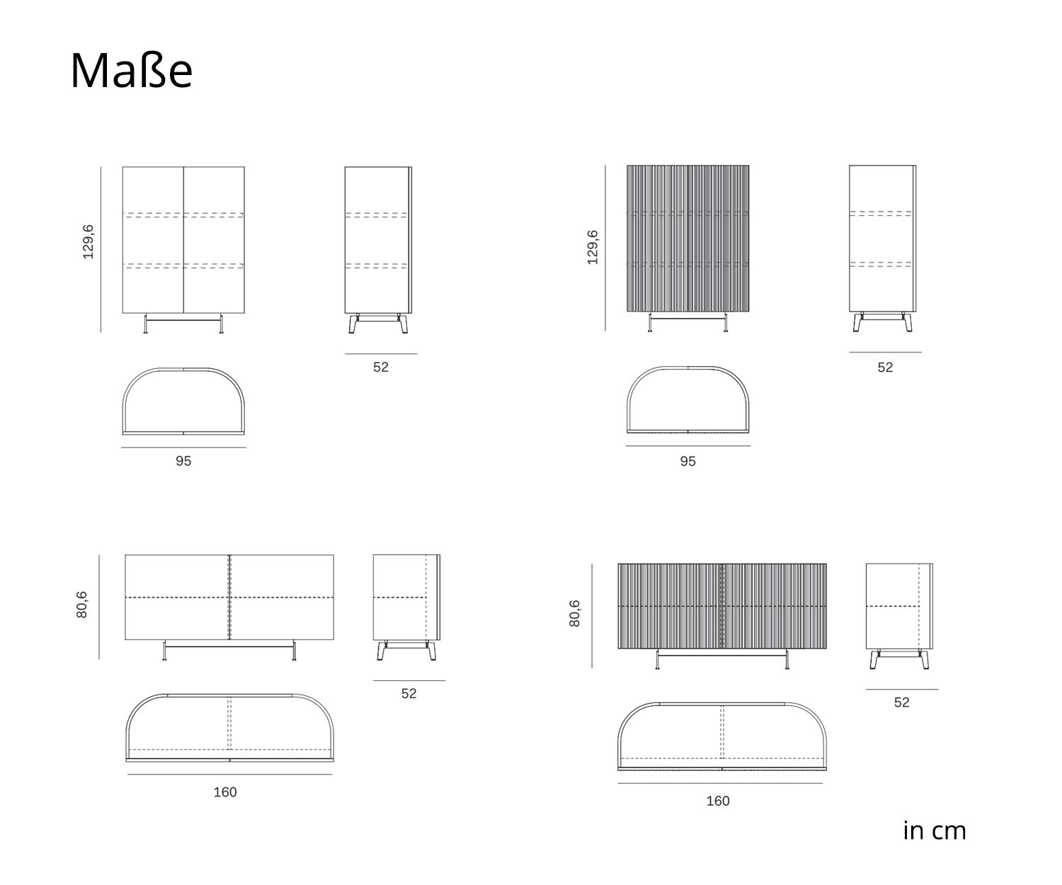 Innenausstattung: Hinter den Türen des Novamobili Design Sideboards befindet sich ein Glas-Einlegeboden. Der Innenraum ist in derselben Farbe wie der Außenkorpus lackiert. Beim Highboard sind es zwei Glas-Einlegeböden pro Tür. Bitte schauen Sie sich die Skizze an, um zu erfahren, wo Einlegeböden verbaut sind. Die Einlegeböden sind fest und nicht in der Höhe verstellbar.