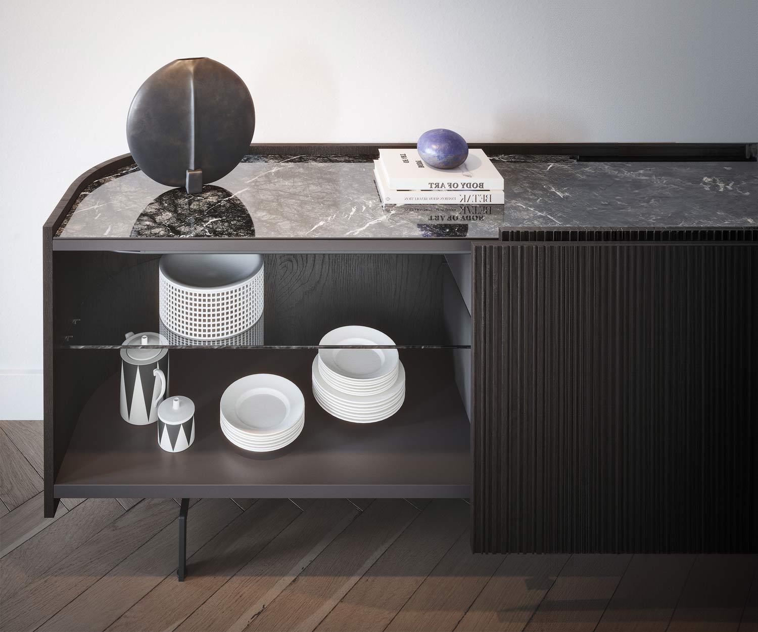 Das Design von "Bay" zeichnet sich durch sein elegantes, geschwungenes Profil auf der Rückseite aus, welches die strenge Geometrie des Möbelstücks aufweicht und ihm einen hohen Wiedererkennungswert verleiht. Die Türen des Sideboards sind sowohl in einer einfachen, glatten Ausführung als auch mit senkrechten Streifen erhältlich und können als Flügeltüren oder flächenbündige Schiebetüren konfiguriert werden. Diese Designoptionen ermöglichen eine personalisierte Ästhetik, die "Bay" zu einem markanten Highlight in jeder Einrichtung macht.