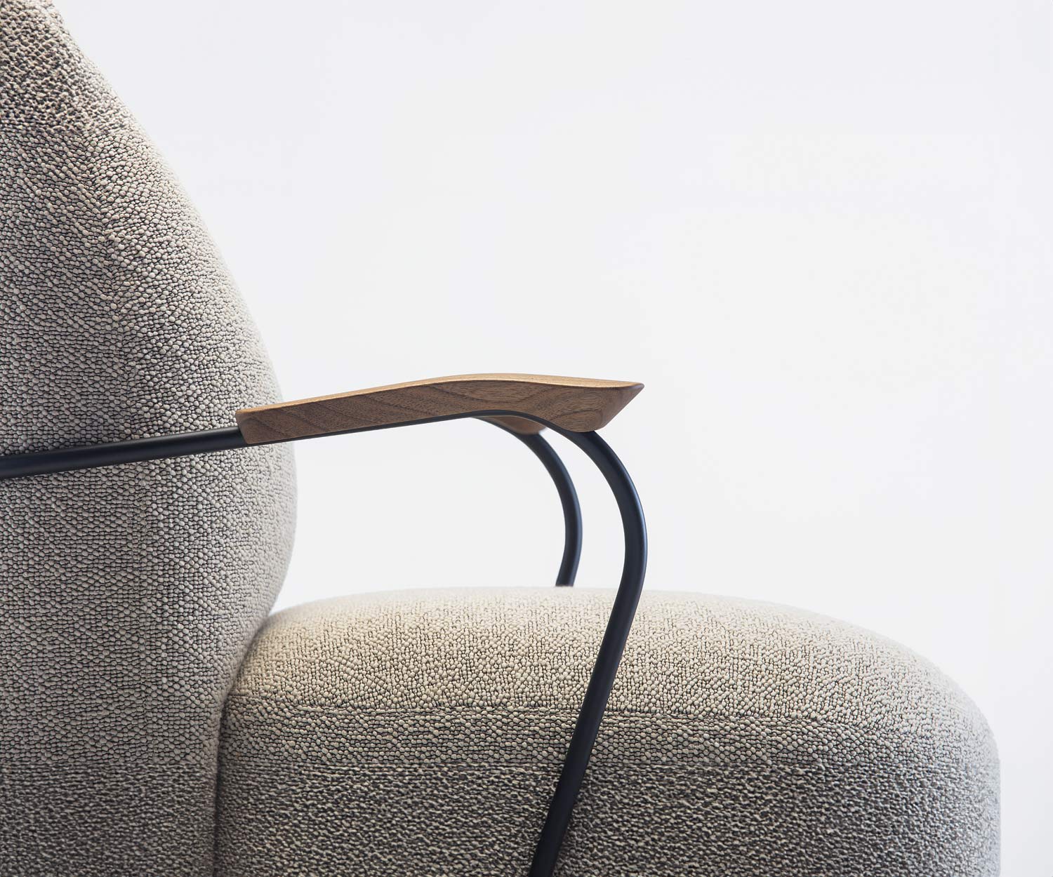 Der Buffa Sessel ist erhältlich in Bouclé Beige (Orsetto 01/02), Hellgrau (Orsetto 02/22) und Dunkelgrau (Orsetto 98/21).