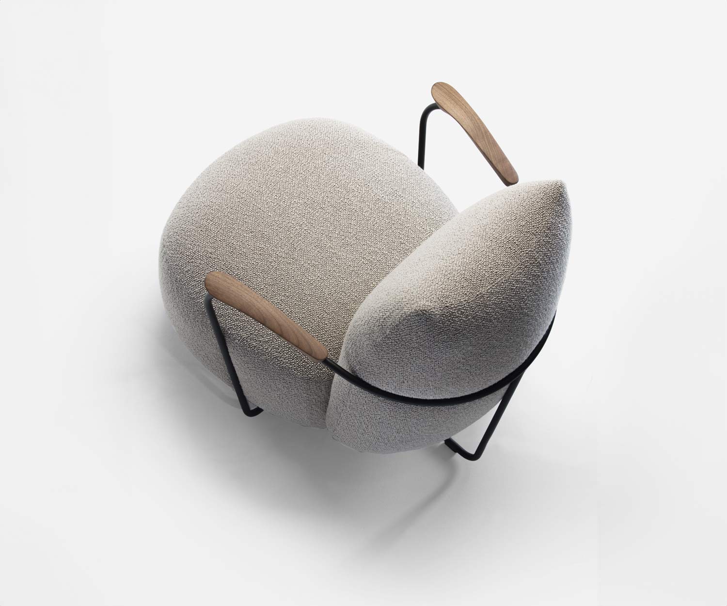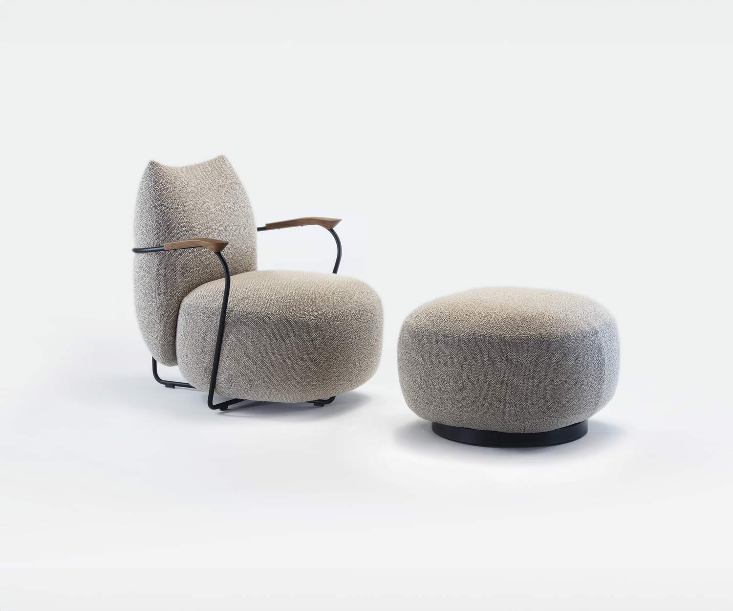 Passend zum Sessel gibt es den Buffa Sofa aus Bouclé. Der dazugehörige Hocker kann auf Anfrage bestellt werden.