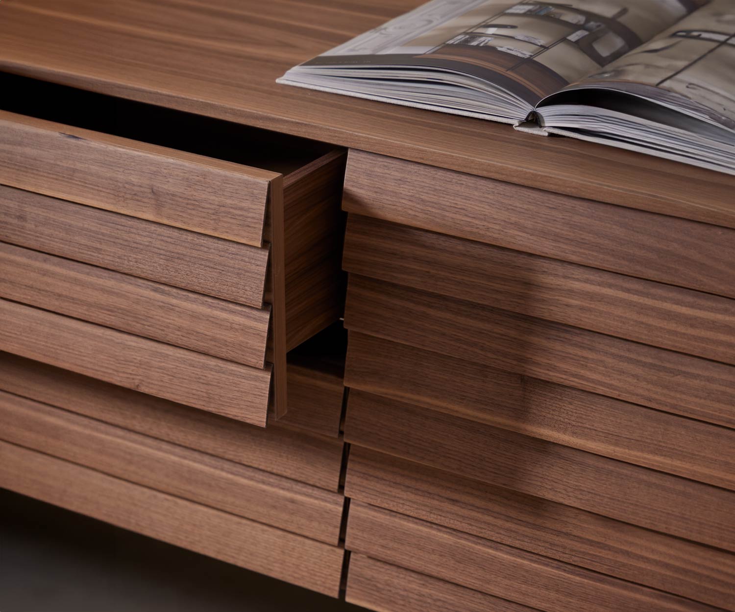 Je nach Bedarf kann jede Breite des Punt Design Sideboards Sussex entweder mit flachen 2 cm oder 28 cm hohen Füße bestellt werden. Als hohe Variante wird es gerne als TV Schrank genutzt. Für das Punt Sussex Sideboard werden ausschließlich hochwertige Gleitschienen von Hettich aus Deutschland verwendet. Die Lamellenfront des Sideboards dient gleichzeitig als unsichtbarer Griff und geht flüssig in das Design über. Der Unterschied zwischen Tür und Schublade ist nicht sichtbar. Dank der Hettich-Schienen laufen die Schubladen besonders leise und ziehen sich immer automatisch zu (Soft-Close Dämpfungstechnik). Auch bei den Türen wird der automatische Einzug per Soft-Close-Technik verwendet.