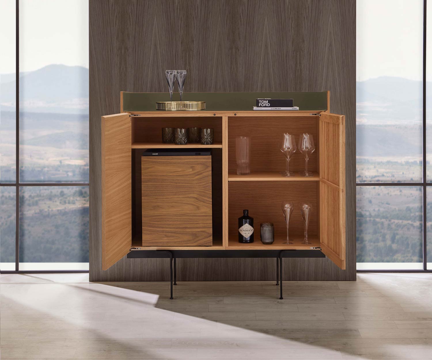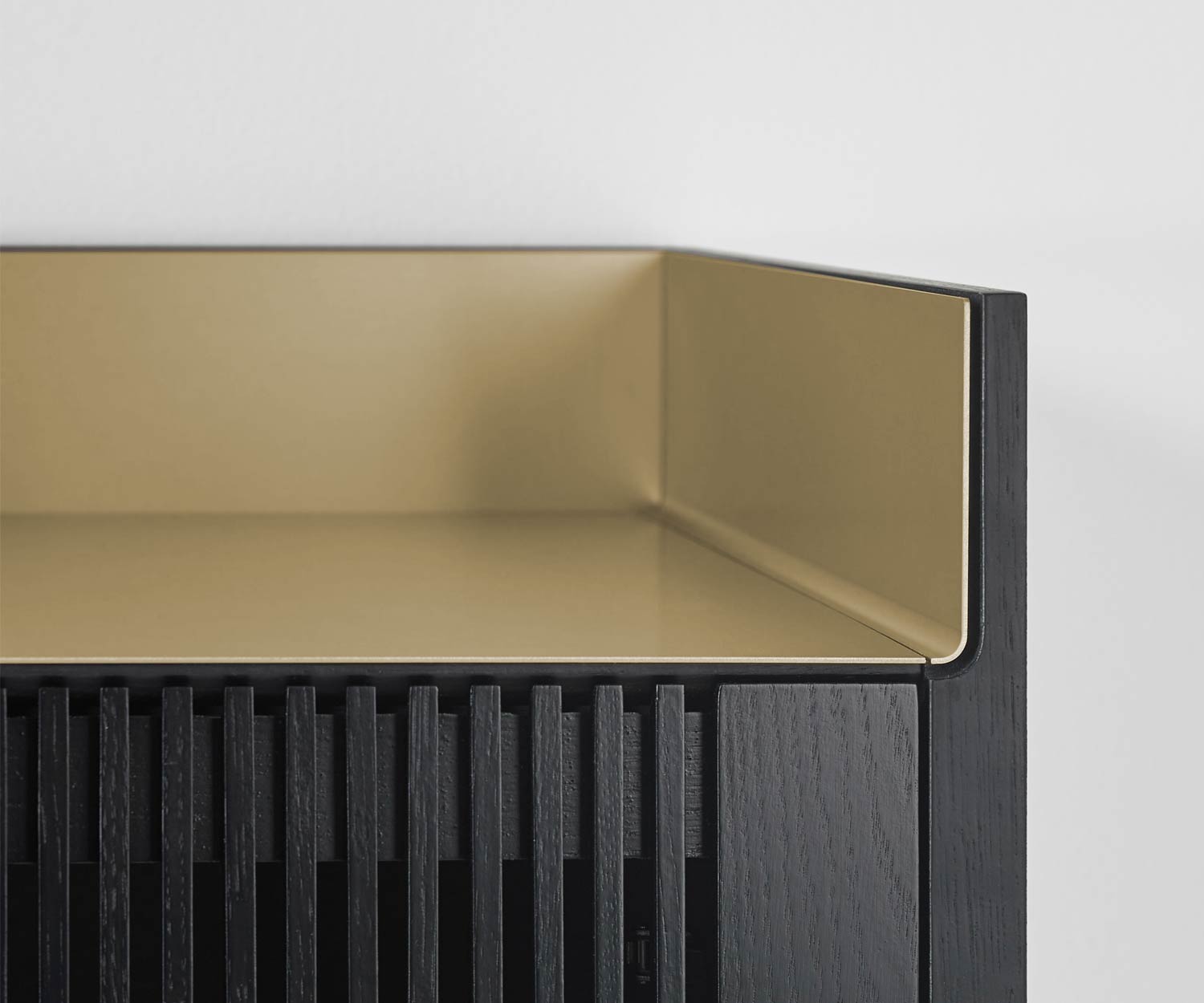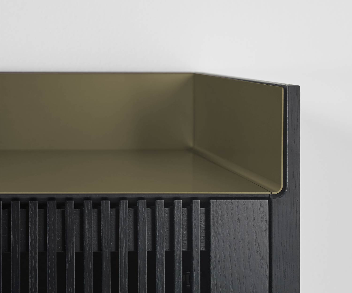 Die Abdeckplatte gibt es in den Farben Aluminium Gold und Aluminium Bronze. Korpus und Front sind erhältlich in Super Matt Eiche, Super Matt Walnuss oder Dunkel gebeizter Eiche (Stained Oak Ebony). Die Standfüße gibt es in der Farbe Schwarz RAL9005.